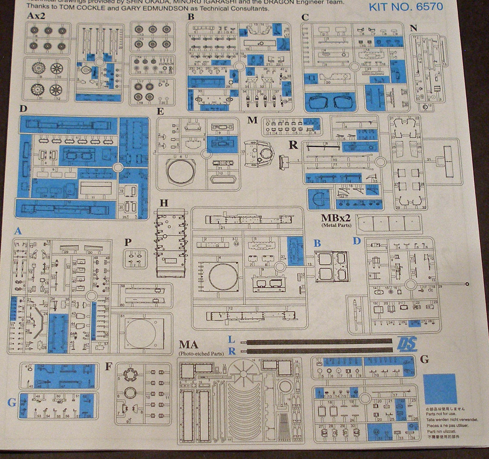 Note that Dragon has thoughtfully stamped each section of each sprue with the sprue letter (A, B, C, etc.). For example: Sprue 'A' has six separate sections, which are now all stamped with 'A'. With the way I build models this has been a tremendous help in distinguishing the many sprue sections, especially after I am well into the build and the sprues have become barely recognizable. Bravo, Dragon – great idea!