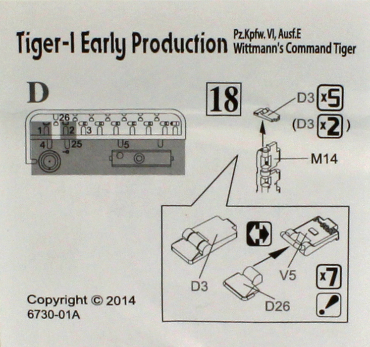 The Tiger is a pretty straightforward tank to build. Chassis, fenders, main deck, turret, gun, hatches – it's all there. There are an abundance of options (18) even though this is a representation of a specific vehicle. As a consequence, there are some up front decisions to be made regarding mostly hatches and wheel alternatives.![]()