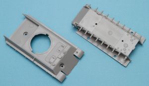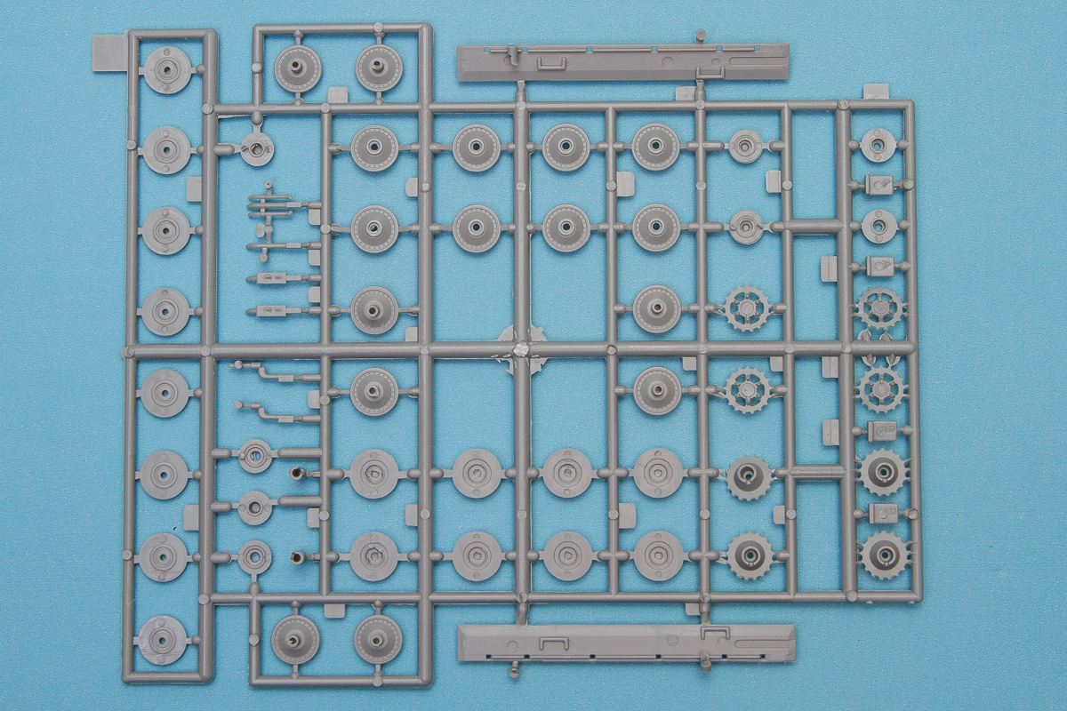 For the running gear, this is a typical German tank, which means you get to add lots and lots of wheels. Granted, not as many as some, but you'll still be assembling two drive wheels, to idler wheels, and eight road wheels, each of which are made up from two parts each. Once the wheels are in place, you can add the DS tracks and then fit the side skirts in place. Interestingly, the instructions show those in place, but both the boxtop and the painting instructions show the vehicle without them.