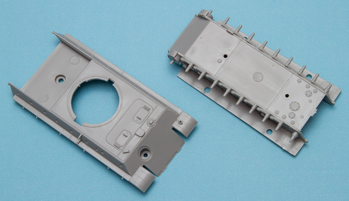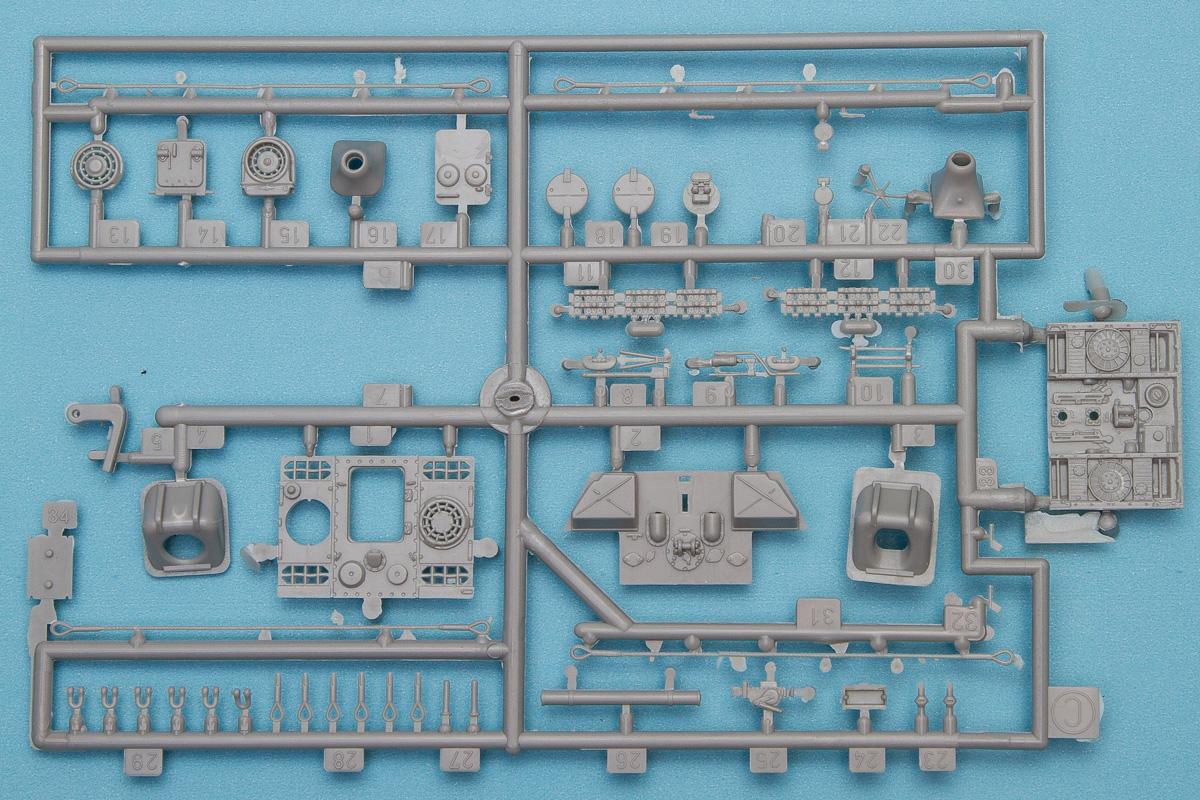 Assembly of this kit follows the Dragon Panther kit, with the hull split into upper and lower pieces. The engine deck is detailed in an interesting way, with one piece providing the various detail bits underneath the separate upper deck. With that in place, the back end of the hull can be added, which gets separate exhausts and other details. The exhaust pipes will benefit from some thinning out, as the wall thickness is definitely not to scale.