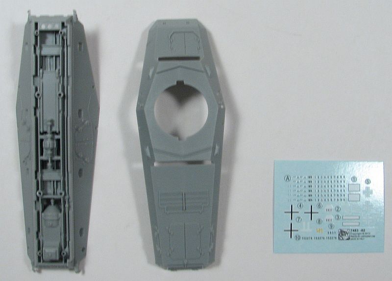 Construction starts with the differential and suspension, gluing it all to the lower hull. While the instructions have you glue the tires on now, I'm uncertain if you have to, or if there's a way to glue them on after the fenders are attached to the upper body. If you're unable to do that, then painting the tires after the main hull could be "fun".