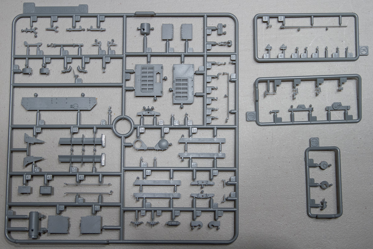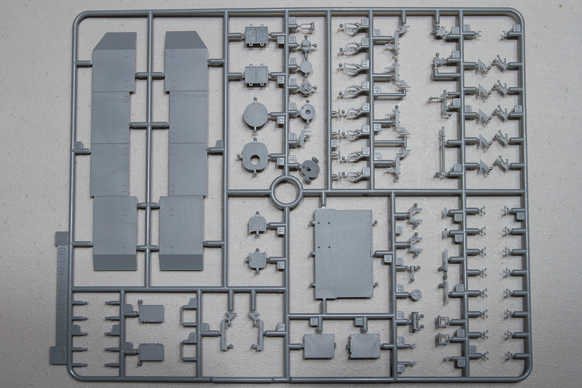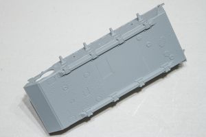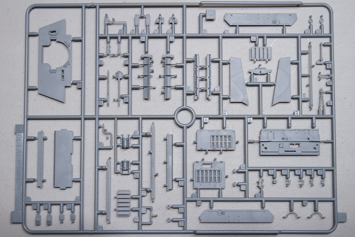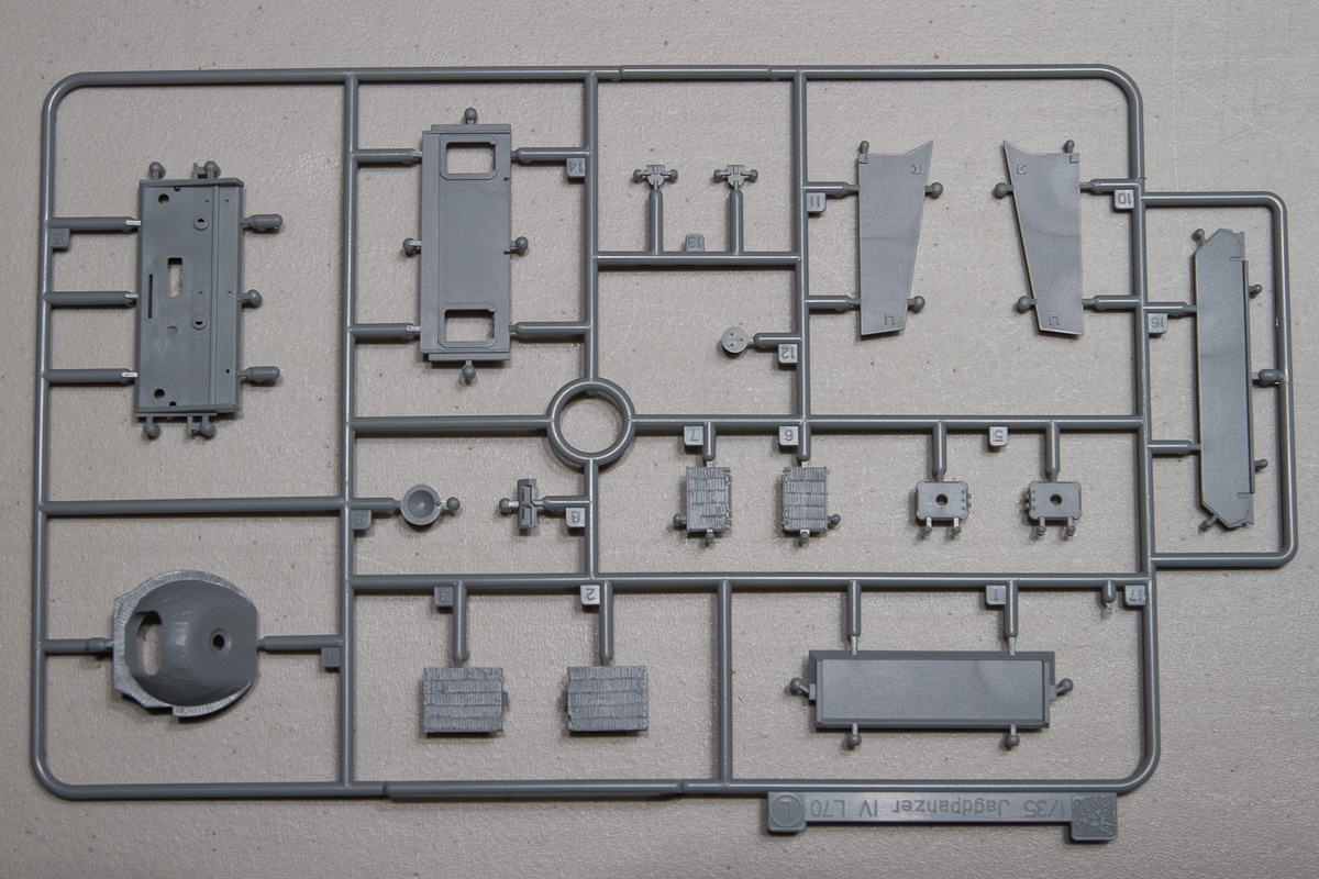The lower hull is one beautiful, slide-molded piece, as is the back deck, the upper-front hull and the rounded gun mantlet. All the smaller parts that sport a gorgeous zimmerit coating come on a single sprue. The side ‘schurtzen’ shields that give German assault guns and tank destroyers their distinctive look are single piece affairs that are molded very thin and look to be in proper scale. The attachment points for the shields and related hardware are engineered to make this part of the assembly as simple as I’ve seen it. Bravo Dragon.