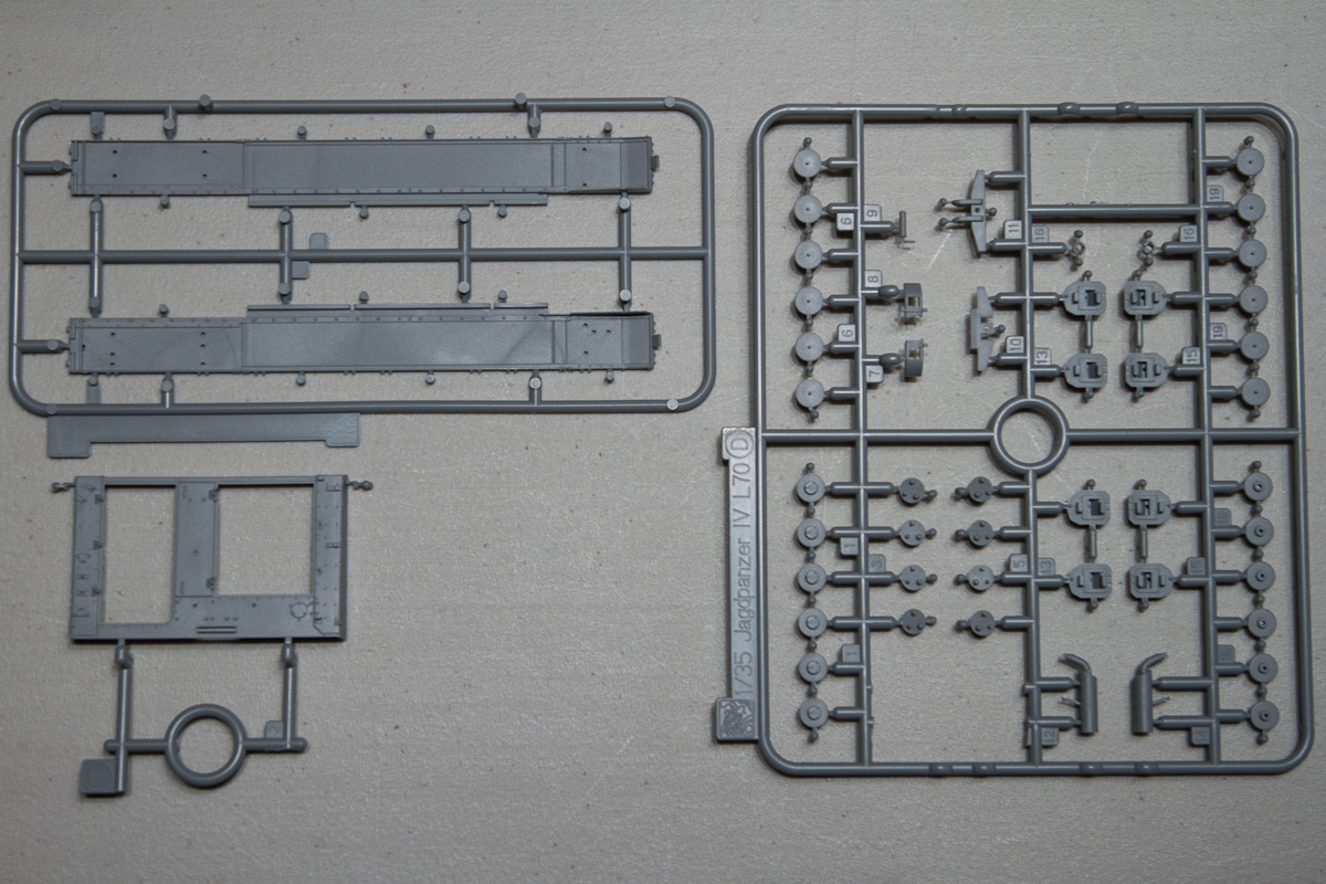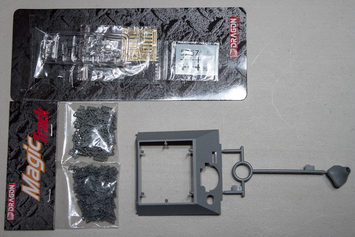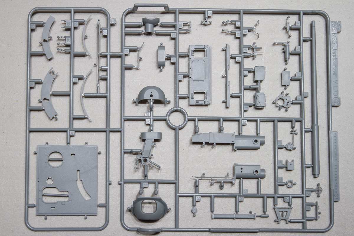 Modelers who have built any of Dragon’s more recent releases will be familiar with the boxed contents here. The Jagdpanzer comes in a thin, over-stuffed colorful box containing 14 sprues of soft, light-grey plastic. There is a separate, cardboard-backed collection of clear parts, photo-etch, decals and Magic Track. The track is molded in two shades of grey to help distinguish the ‘sided’ track-links.