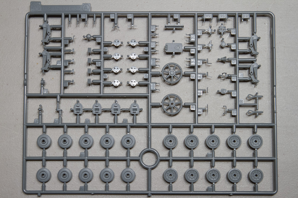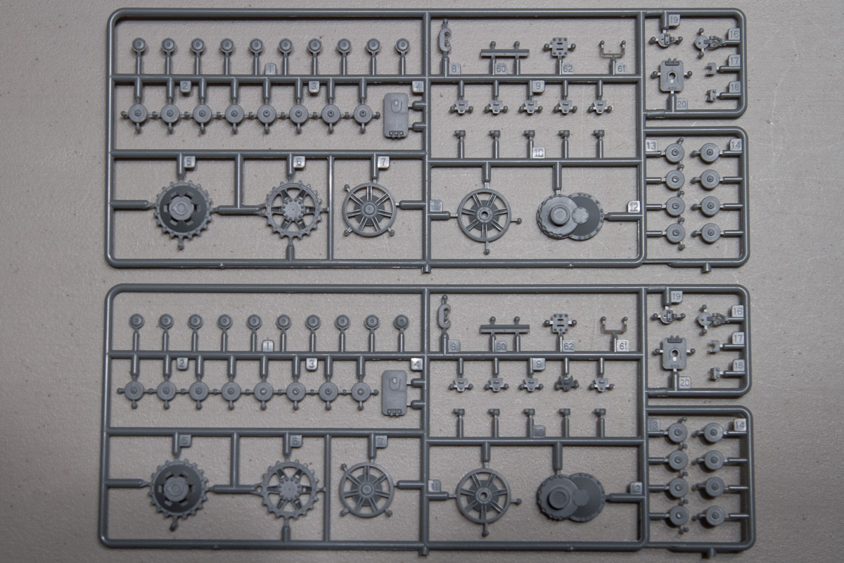 Construction starts with the lower hull and main running gear, no surprises here. The wheels, return rollers and drive sprockets are molded up to Dragon’s excellent standard. The instructions, unfortunately, also meet Dragon’s standard for instructions. In this step, the instructions reflect the assembly of six return rollers, not the required eight. Looking further, it seems that the return-roller guy was writing for the later version that used the lower number of rollers.