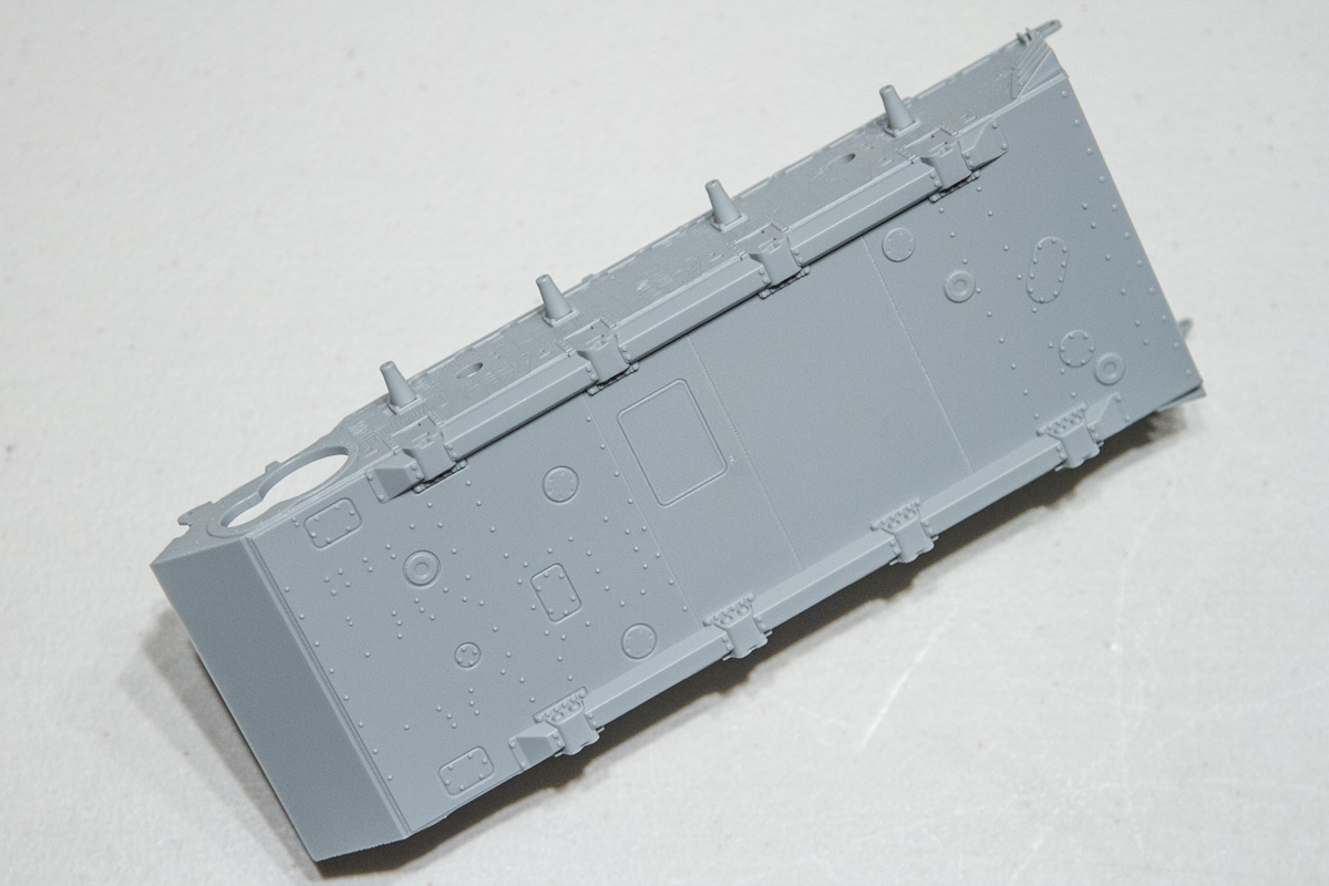 Steps three through six finish out the lower hull. You are given three build options (among no less than 28 throughout!). These three decisions involve a limber hitch and what looks like a small, side-mounted mud shield of some kind.