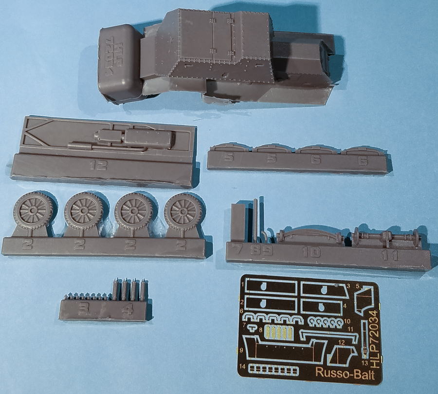 The Hauler 1/72 Russo-Balt Type C consists of 27 pieces of gray resin and a photoetch fret with 33 pieces. There are no decals as most pictures show an un-adorned armored car.