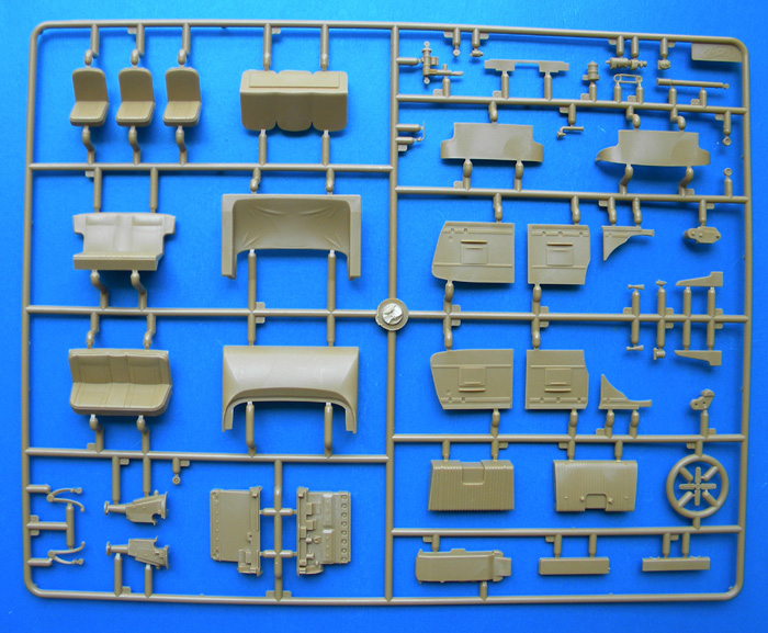 At first look, I was amazed and the shear number of parts. And quality parts at that! The fine detail on some parts was astonishing. But ICM did an excellent job. Some of the key ares of note are the multi-piece tires that have a high level of tread detail, the highly detailed engine, and the finely crafted steering wheel [multi-piece]. Two things I was a bit disappointed by were the single piece sides of the main cabin and the single piece hood sides. With such a nice interior and engine, I would have liked to have seen options to assemble them in the open position. However, a little care with a No. 11 blade, and that can easily be fixed. Another let down was the decals, which do not feature the swastika in the center of the flags. This is to be expected though, since the kit is manufactured in the Ukraine.