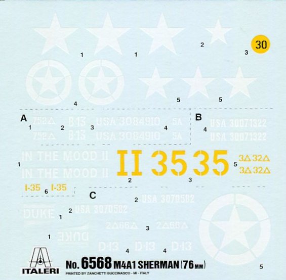 Zanchetti Buccinasco printed the small but excellent decal sheet. The images are crisp, the colors are bright and the printing is in register. It includes markings for 3 different tanks: