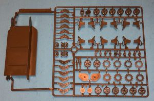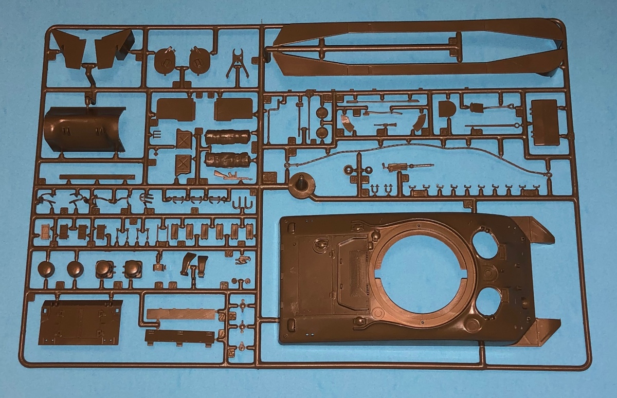 The kit is well molded with moderate flash and minimal sink marks. The sprue attachment points are well located and the parts will be easily removed. The tank hull is nicely executed with an acceptable level of detail. There a lots of parts to add (tools, etc.) and it will look appropriately busy when you are finished. I would replace the included towing cable with picture wire as it will have greater detail. You might also consider replacing the kit grab handles with self made wire handles for greater realism and convincing scale thickness.