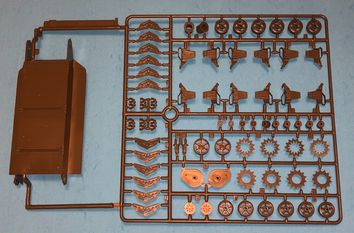 The suspension bogies and wheels have a good level of detail. The drive sprockets are also well done. The rubber band tracks aren't bad but don't offer the convincing "sag" of plastic or metal link-and-length tracks.