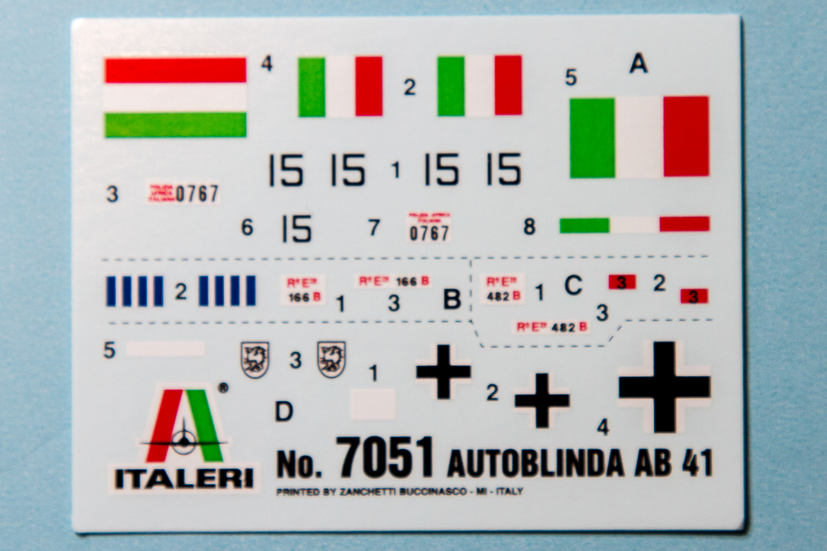 Italeri's kit of the Autoblinda AB 41 is a fairly new one, first arriving in 2007. Since then, it has undergone slight changes, with one release updating it to AB 43 standard and another taking it back to the original AB 40 design. This latest release is actually a stock re-release of the original 2007 kit, with the same box and markings. Inside the box, you get a single sprue of gray plastic, a small decal sheet with options for four vehicles, and instructions. There really is not much to this, and on quick glance, this has the makings of a fast, fun weekender project.