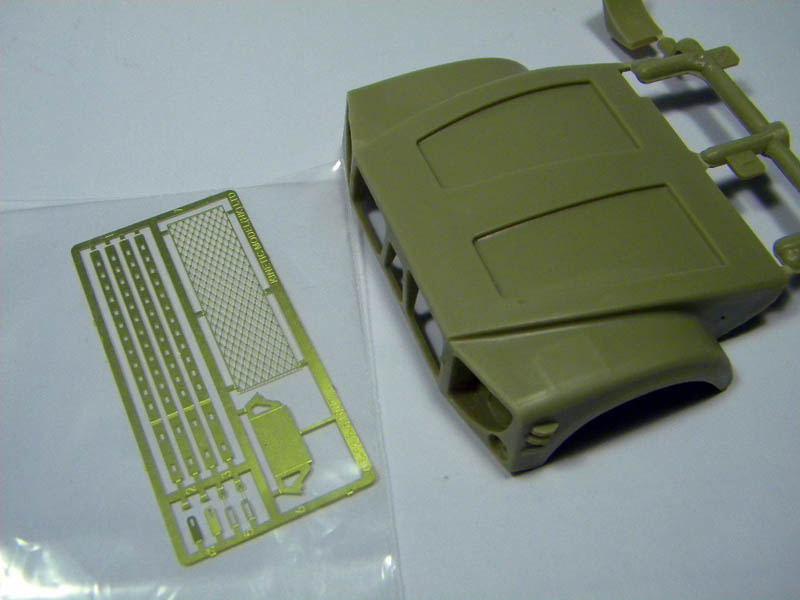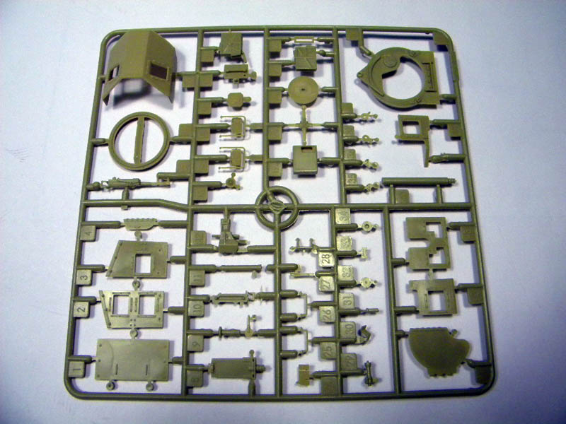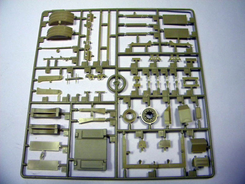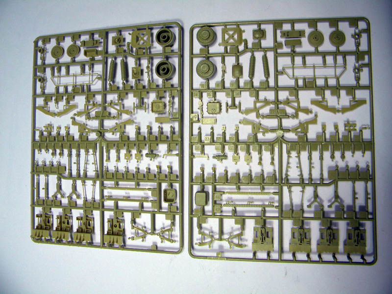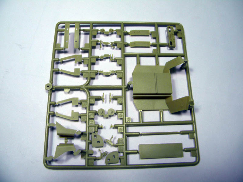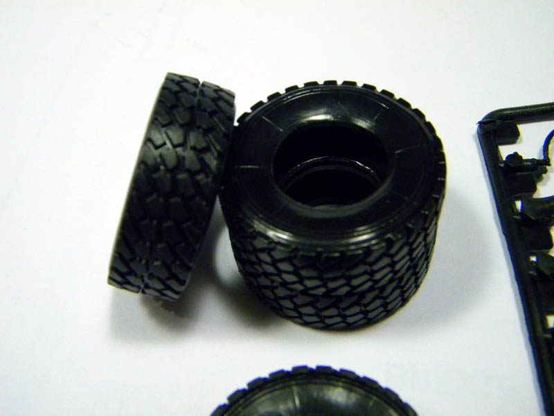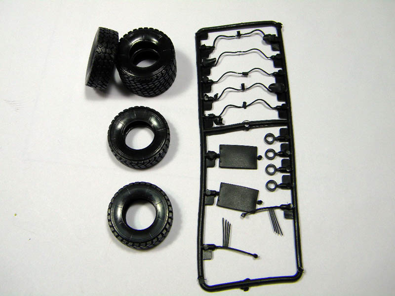 This is the first release from Kinetic in 1/35. This kit comes with 10 tan colored sprues, 1 clear part sprue, 1 small PE Fret, 5 vinyl tires, a decal sheet with decals for several different vehicles and a small sprue with vinyl part for mud flaps and break lines. It all totals to around 450 parts. The detail of the parts is good with only very little flash on a few parts. I didn’t notice any obvious mold parting lines. Ejector marks appear to be hidden after assembly.