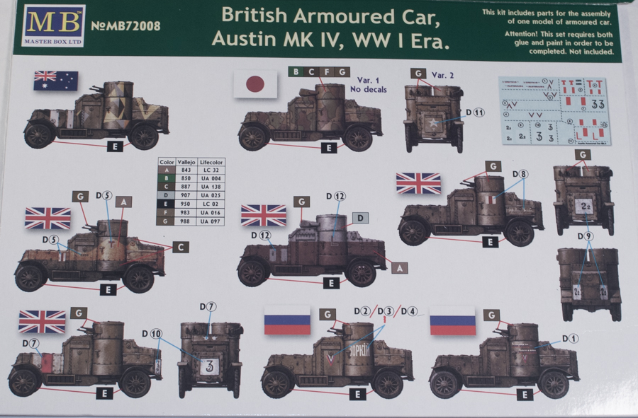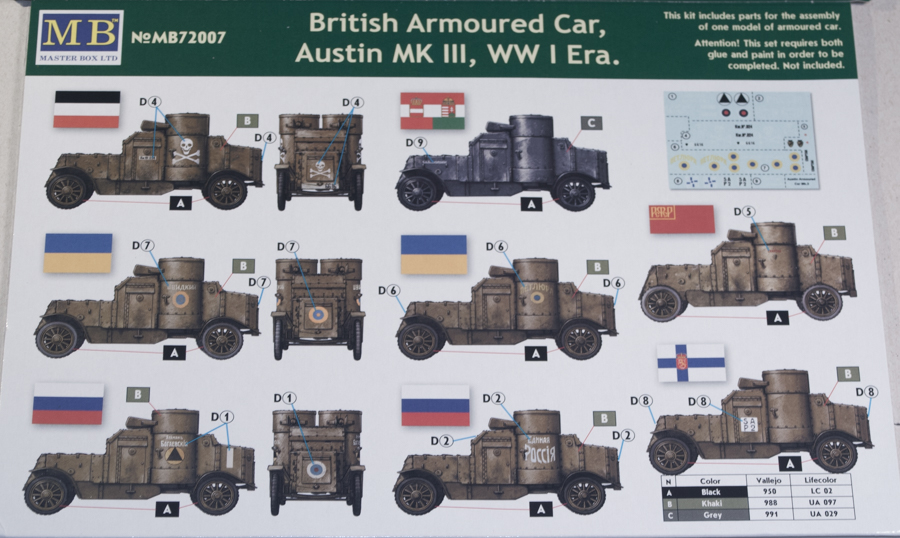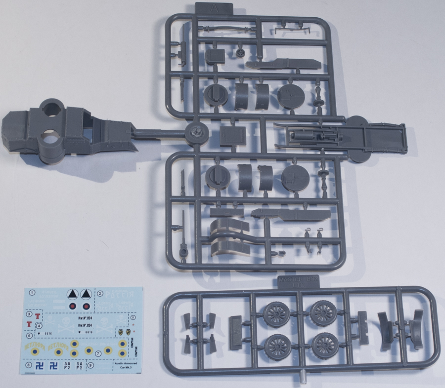 Master Box released two separate 1/72 Austin armored (armoured) cars: a Mk.III and a Mk.IV, both used during – and immediately after – WWI. The Mk.III consists of two, gray-colored plastic sprue with a total of 43 parts; the Mk.IV also has two frets but more parts, 65 in total. This is because the Mk.IV comes with two different styles of wheels. In addition it comes with two different types of weapons along with two different types of "sides" for the turrets. Before starting assembly on the Mk.IV select which version you want to build (three distinct types). The Mk.III is a little easier than the Mk.IV only because there are no choices with assembly.