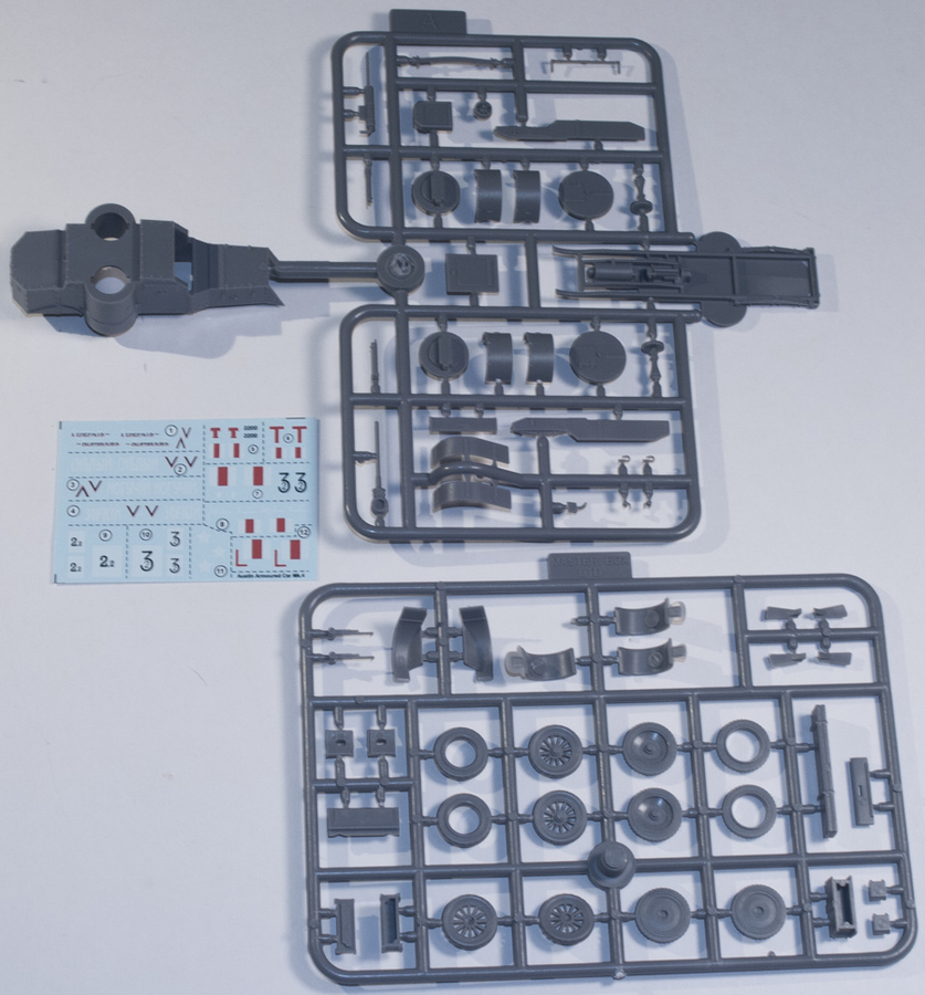 Most of the main body is actually a single piece of plastic to which you add parts to the front: armored windscreen and radiator cover. There is also a piece you add to the top-rear of the box followed by the rear fenders. After adding what appears to be lights the body can then be assembled to the chassis. There are also other items to add to the body now as well, such as a storage box, etc. Finally construction moves to assembling the turrets. In the case of the Mk.III there is only one choice; with the Mk.IV you now assemble the correct turret based on your earlier decision on which Mk.IV variant you want to build.