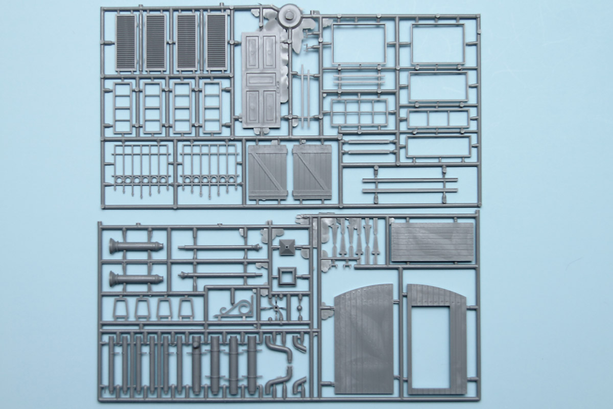 For the injection molded parts, here we get a couple generic sprues found in several of the MiniArt kits. The first sprue provides the door and the window treatments. The windows have a one-piece frame with separate pane inserts. On the same sprue are some parts not for use, such as some ornate iron fencing and a couple of wooden gates. The second sprue provides quite a few parts, but the only parts actually used in this kit are the door, two hinges, and two door handles. That leaves quite an extensive bit of stuff for the spares box, including a complete light post.