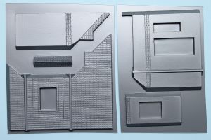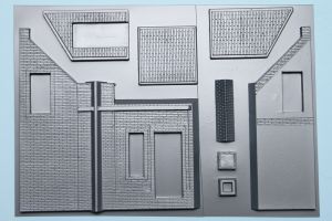 Starting with the basic house construction, this comprises the main house and a side shed. The main house is built up from three side pieces and two front pieces. For all of these, there are separate inside and outside pieces that need to be glued together. As these are all vacuformed pieces, this assembly will take some fiddling around. Luckily, the side shed is much simpler, as there is no interior to deal with. Also on the vacuform side of things is the four-piece chimney, the shed roof, the house roof, the door step and, of course, the main base.