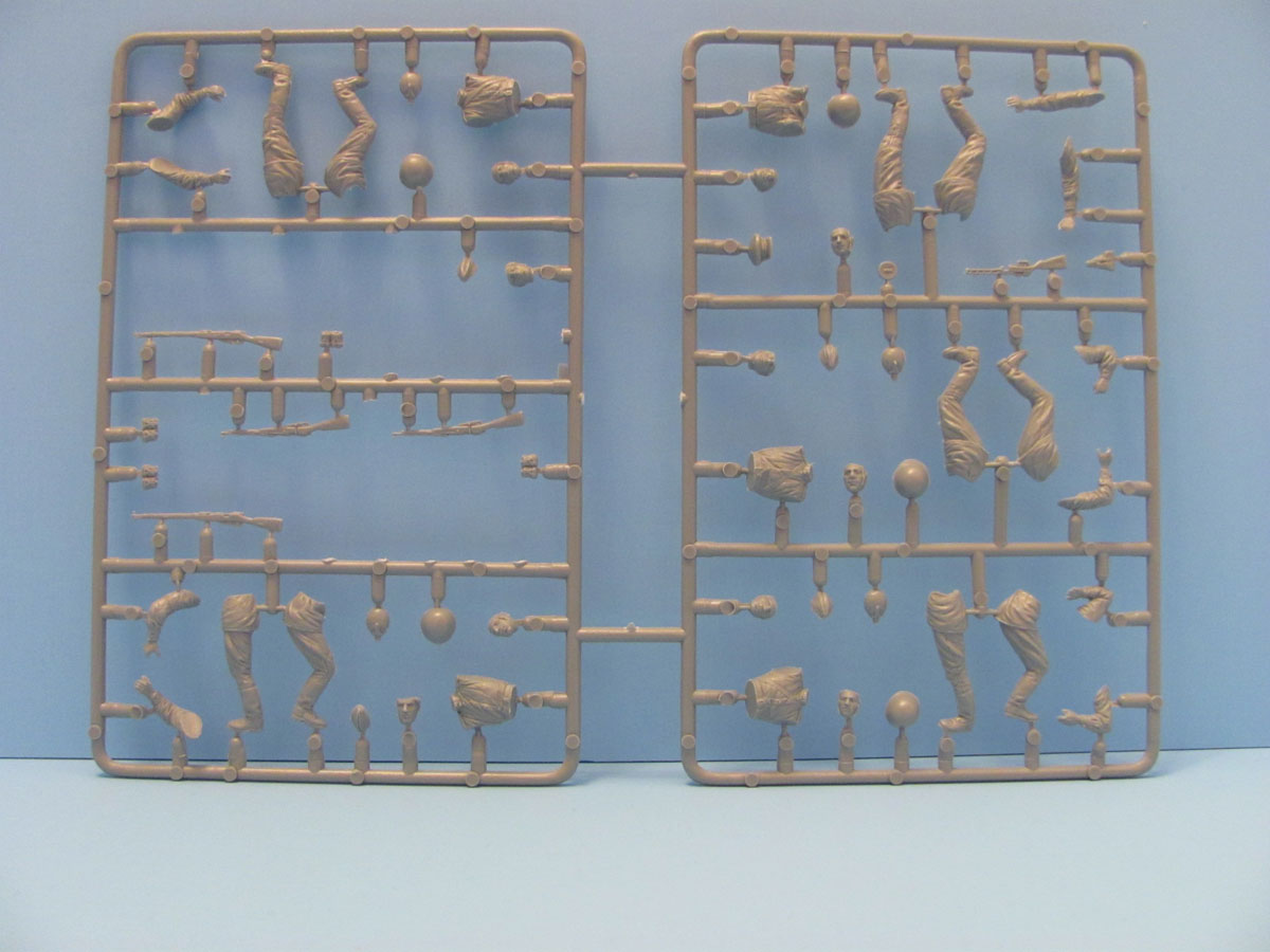 The kit comes in a small box containing 4 light gray sprues with about 210 parts. Not all of the parts are needed, so some extras for the spare box. Three of the sprues are for the gun and one sprue is for the figures. The instructions are printed in color with paint recommendations for Vallejo, Testor, Tamiya, Humbrol, Revell, Mr. Color and Life Color. There are no decals or PE provided with this kit. Let's start with the Figures.