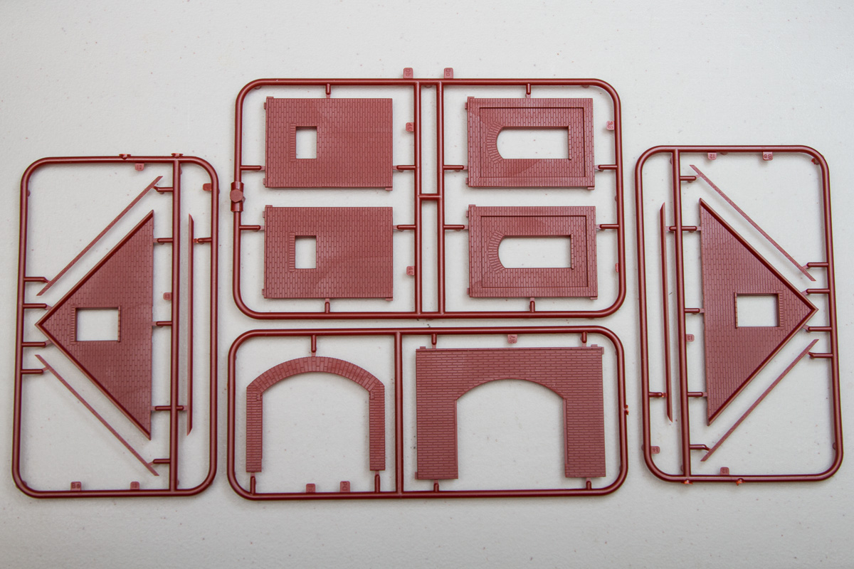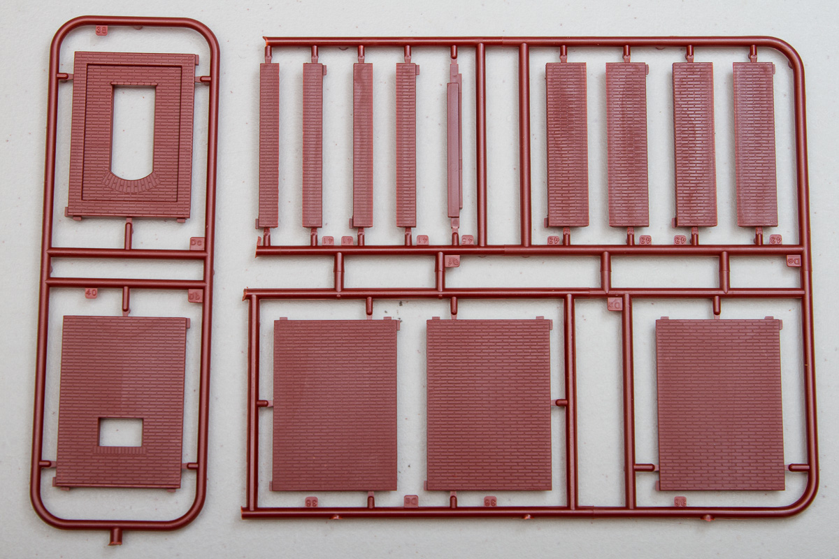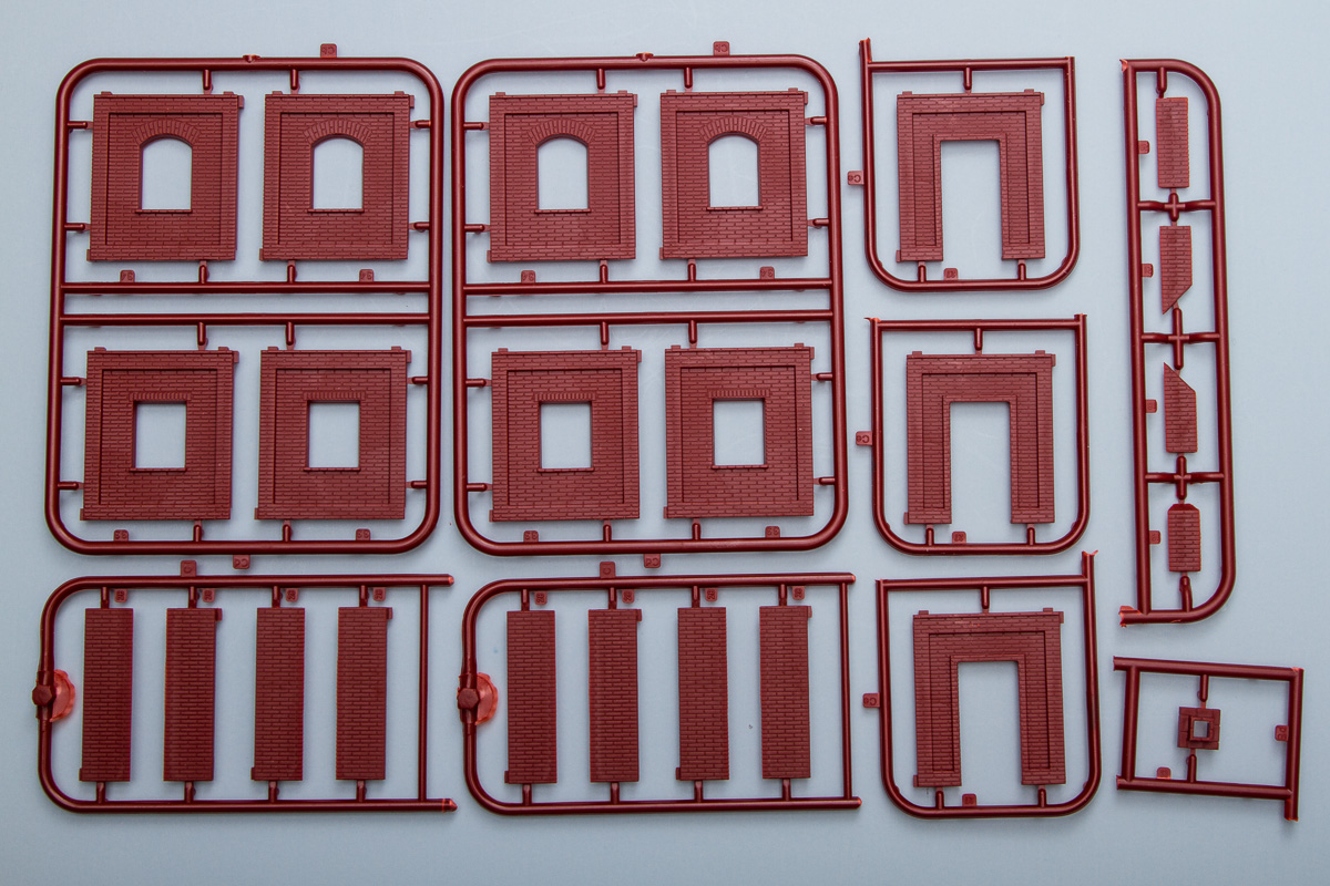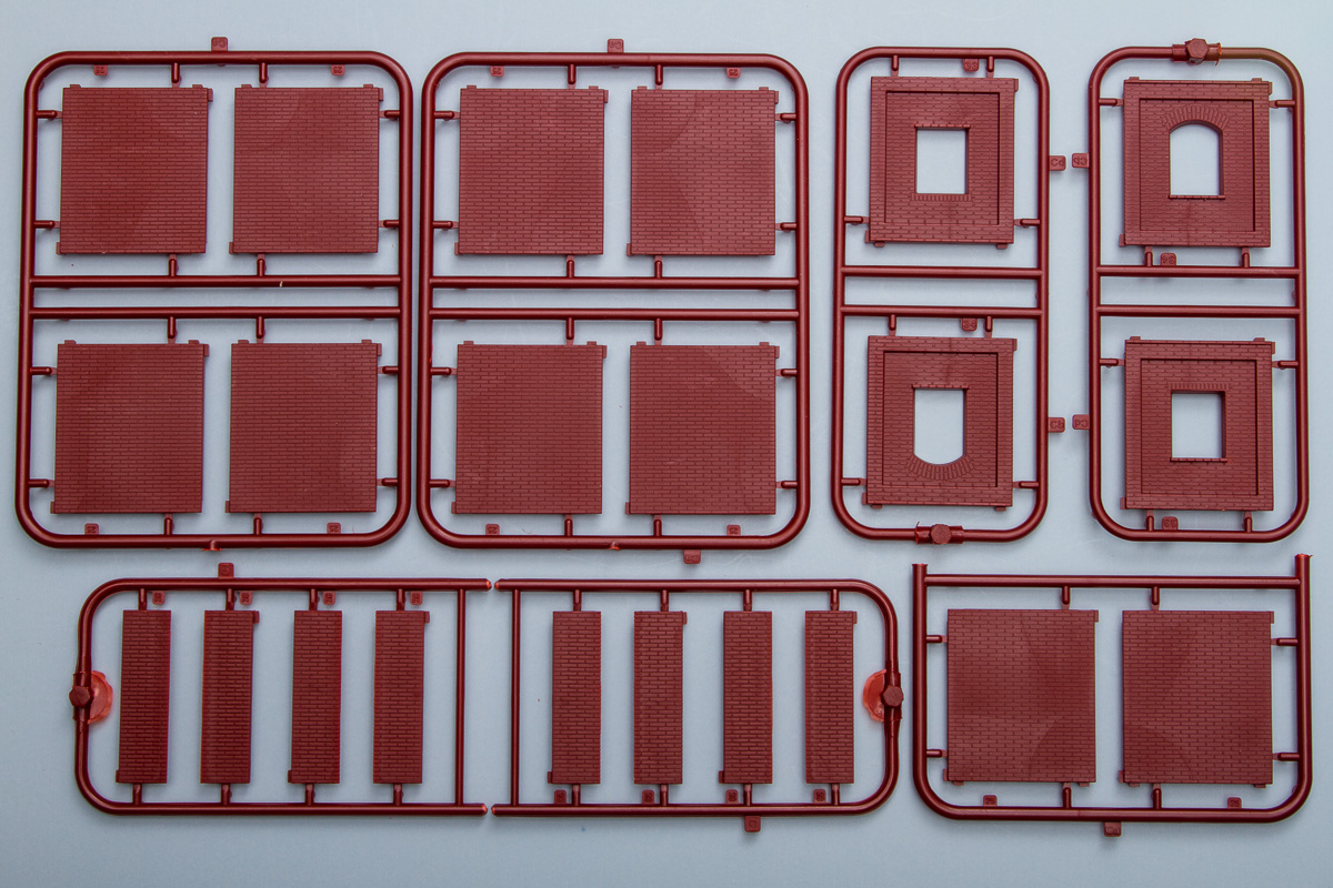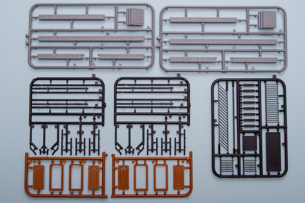 Differing from their 1/35 counterparts, these 1/72 buildings are entirely injection molded (the 1/35 ones generally included vacuformed sections). The kits come molded in a multitude of colors, with most being close to the actual colors of the finished buildings. The detailing throughout the pieces is quite good, being deep enough to handle all sorts of weathering. While some of the surface textures are similar, there is surprisingly little in the way of common sprues between the two kits. That said, the detailing between both kits is identical, so these will fit together in the same scene quite nicely.