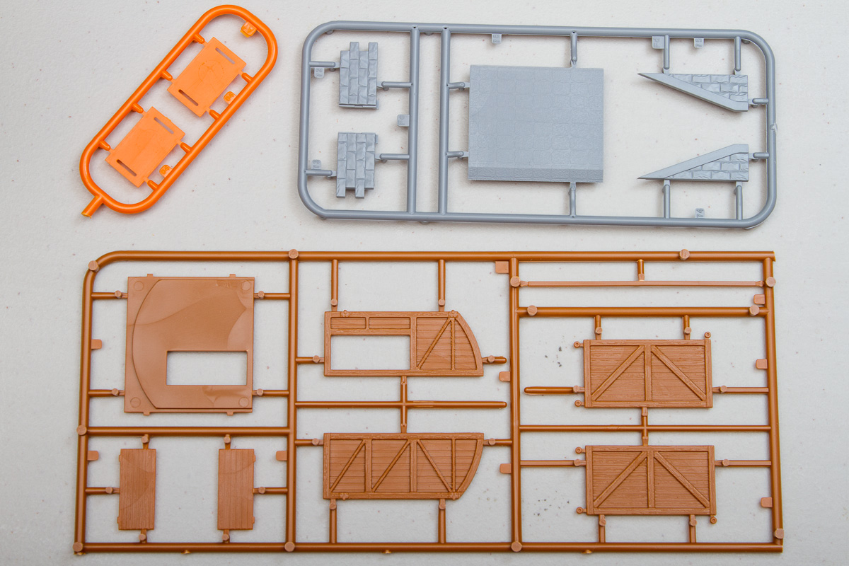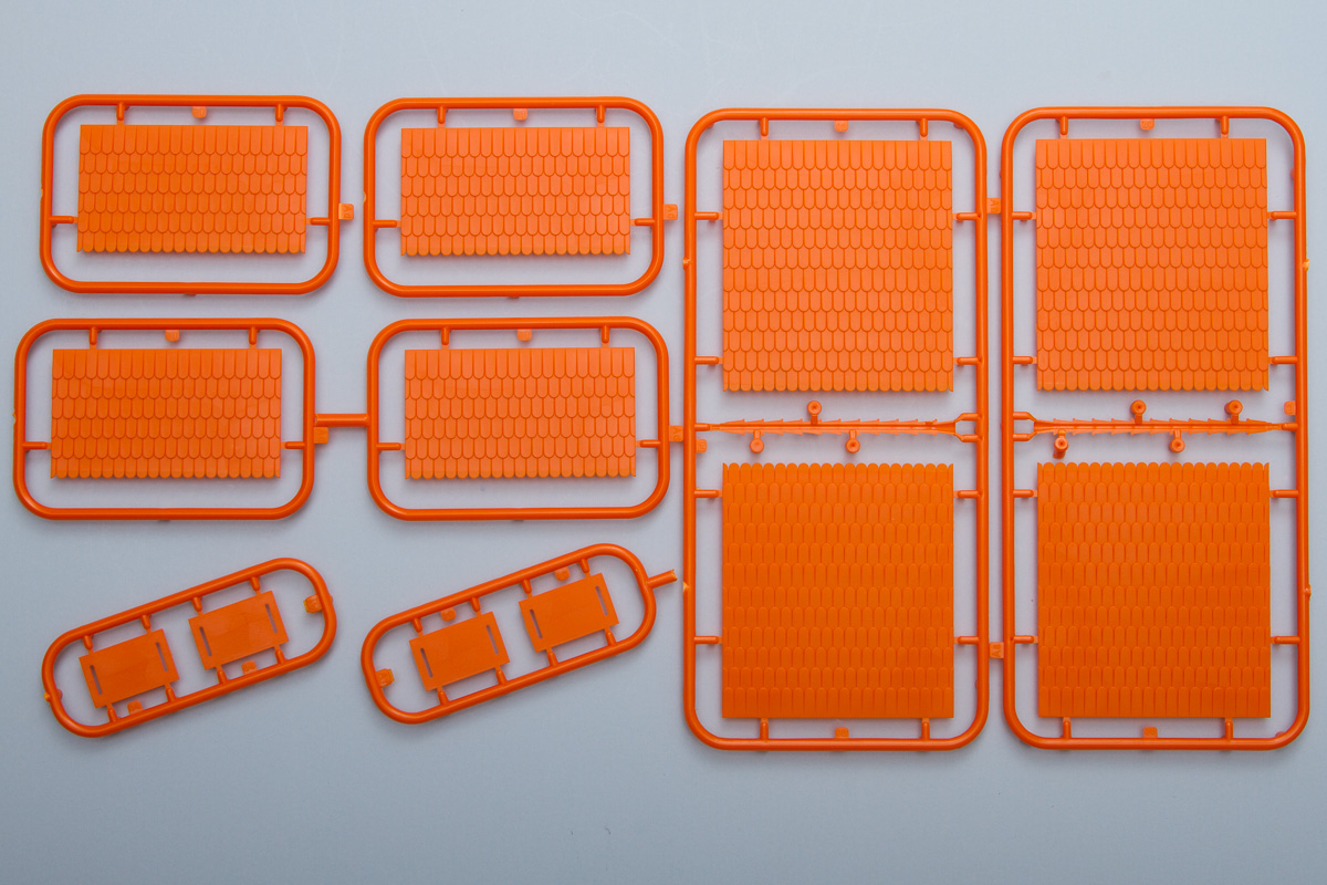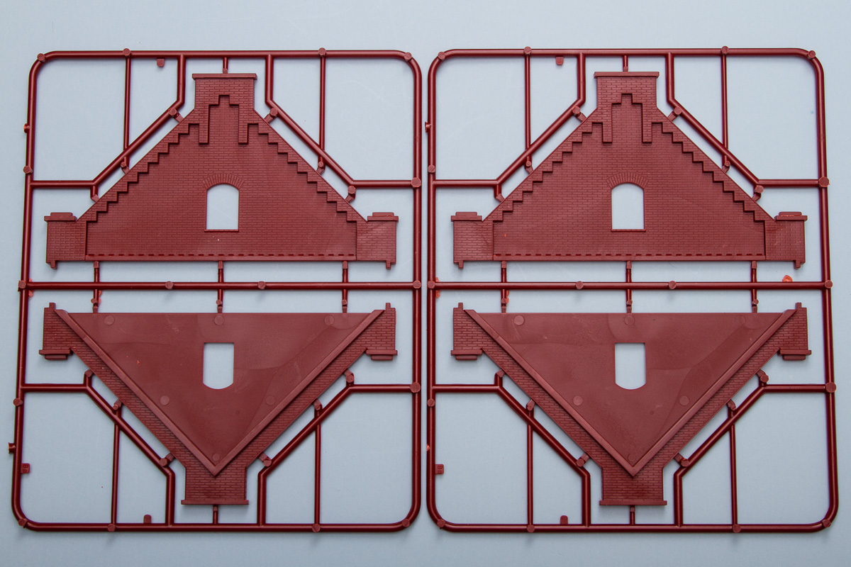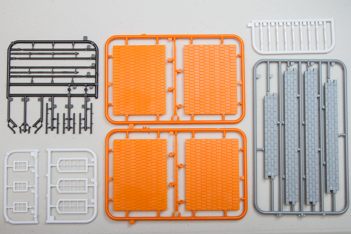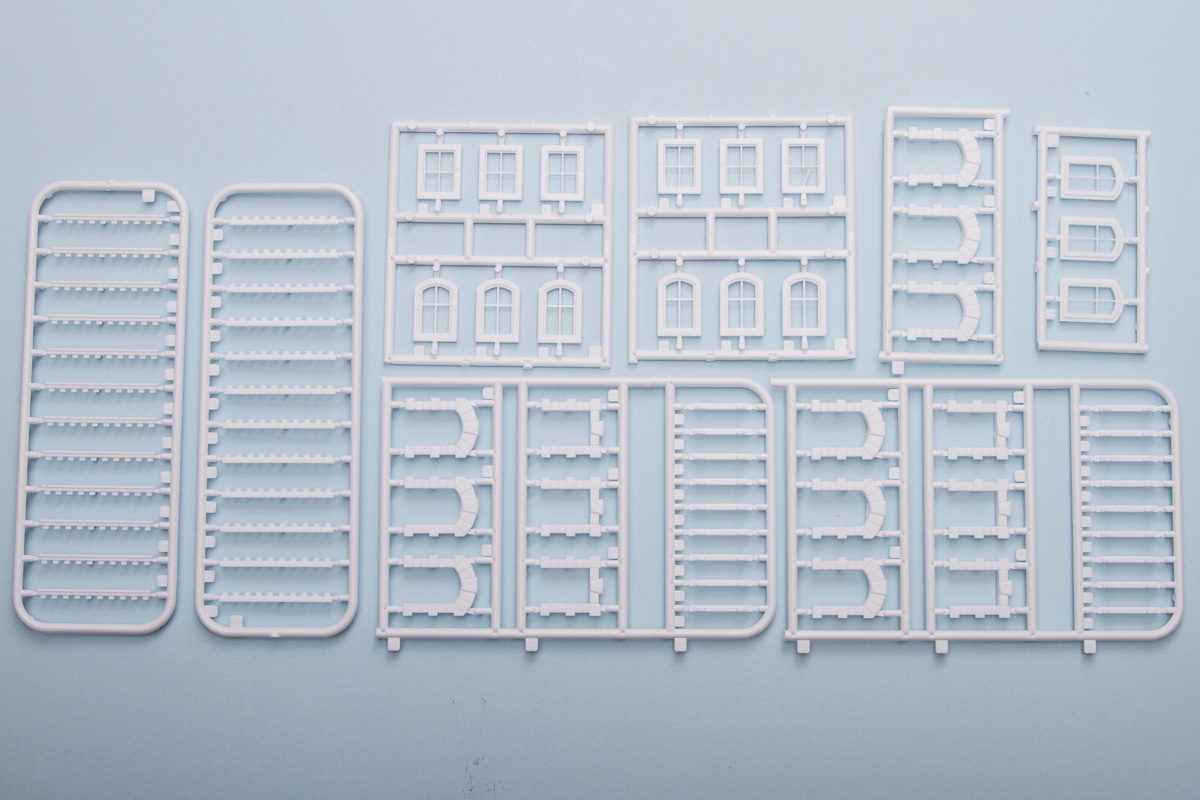 Differing from their 1/35 counterparts, these 1/72 buildings are entirely injection molded (the 1/35 ones generally included vacuformed sections). The kits come molded in a multitude of colors, with most being close to the actual colors of the finished buildings. The detailing throughout the pieces is quite good, being deep enough to handle all sorts of weathering. While some of the surface textures are similar, there is surprisingly little in the way of common sprues between the two kits. That said, the detailing between both kits is identical, so these will fit together in the same scene quite nicely.