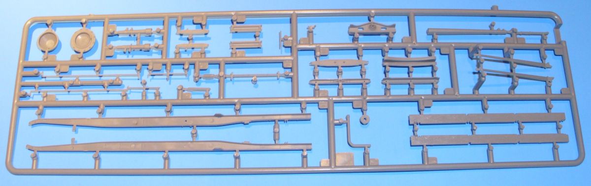 The frame is a remarkable piece of miniaturization. What can be so special about a 1:35 scale frame? First, the frame rails are molded with the inner surfaces open, not solid, as we typically find on models of any scale. In fact, these rails, the cross members, and so-on, all appear to-scale. The wooden beams that are attached to the upper rear frame have individual U-bolts, and their end plates have fine little bolt ends on them. One will want to show some care in removing these U-bolts from the sprues. Finely molded leaf springs - with a very heavy-duty appearance - attach to the frame with separate shackles. These slide-molded springs are filled with detail.