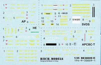 The instructions are very good. They include a parts map and full color pictures of the gun, crew, and the ammunition. They are well illustrated with a logical build sequence; Revell of Germany could learn from Riich Model's example, but I digress. Color callouts are for Gunze (both Aqueous and Mr. Color), Model Master, Humbrol and Tamiya. My impression of this kit is that it is a quality presentation.