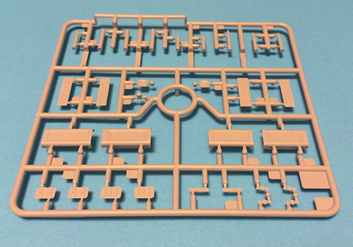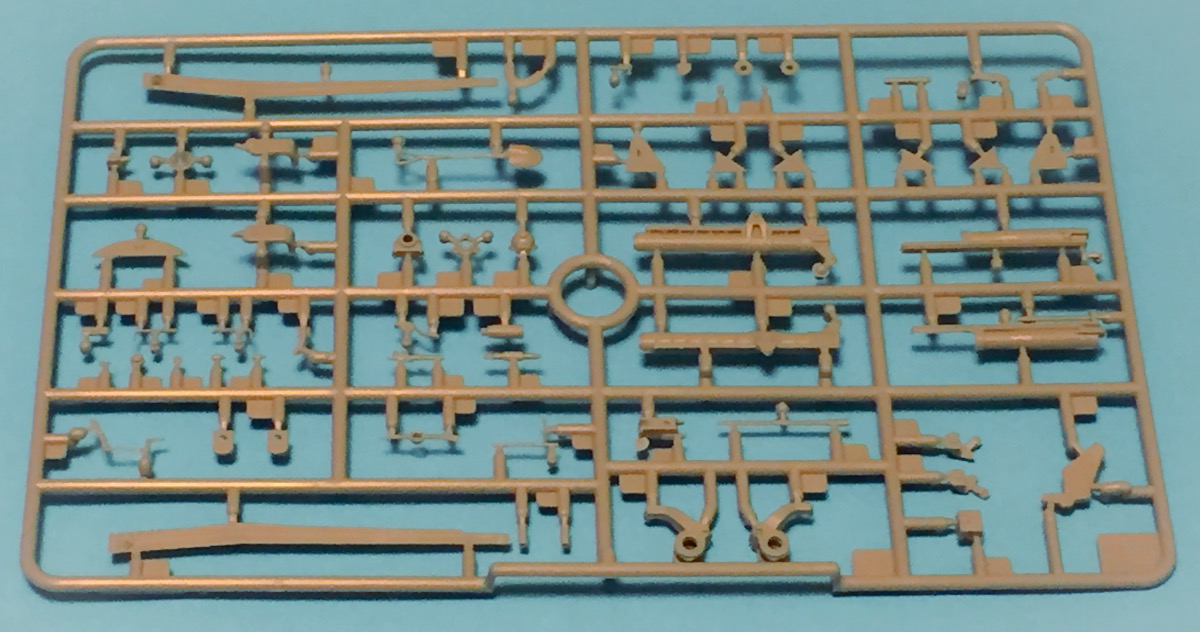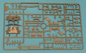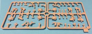 The kit comes in a sturdy cardboard box with decent artwork of the gun and its 4 man crew. It consists of 165 parts on 4 plastic frets, plus 33 parts on a single fret, 2 tires and some string. The plastic parts are very well molded. They are virtually free of flash, with well placed attachment points. But these points are somewhat large. I think that more than 1 type of sprue cutter will be necessary to remove the smaller parts, or perhaps a scalpel, because in the case of the smallest parts their attachment points are bigger than the parts themselves!![]()