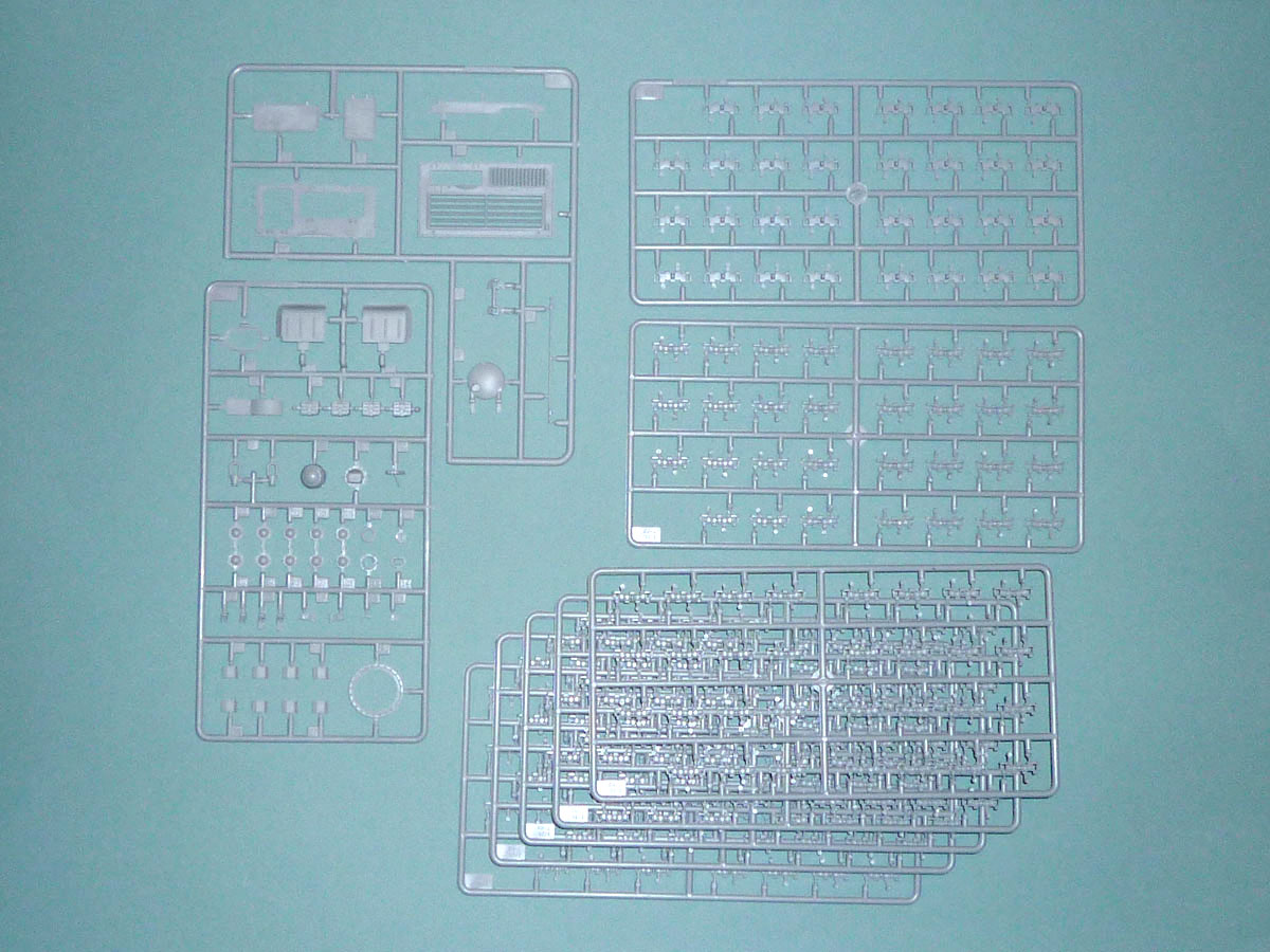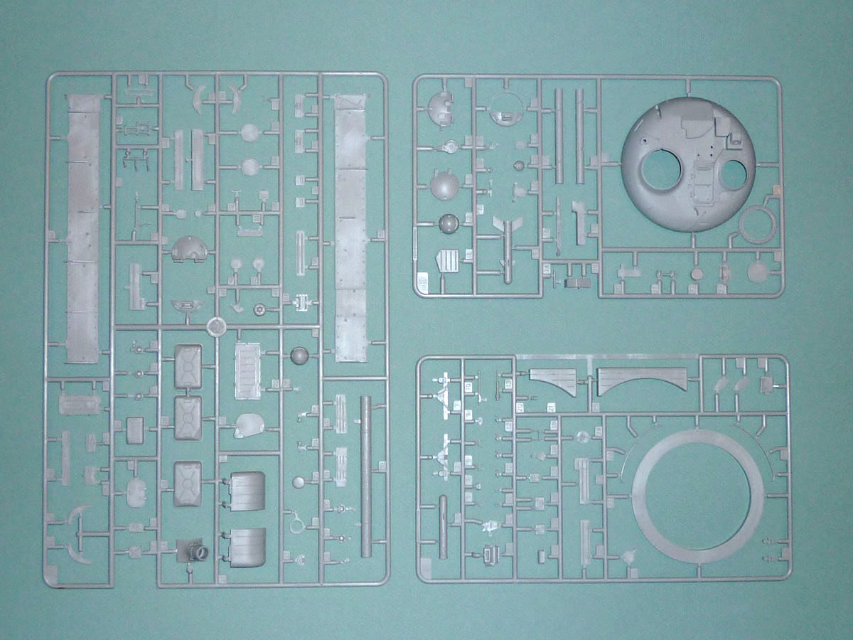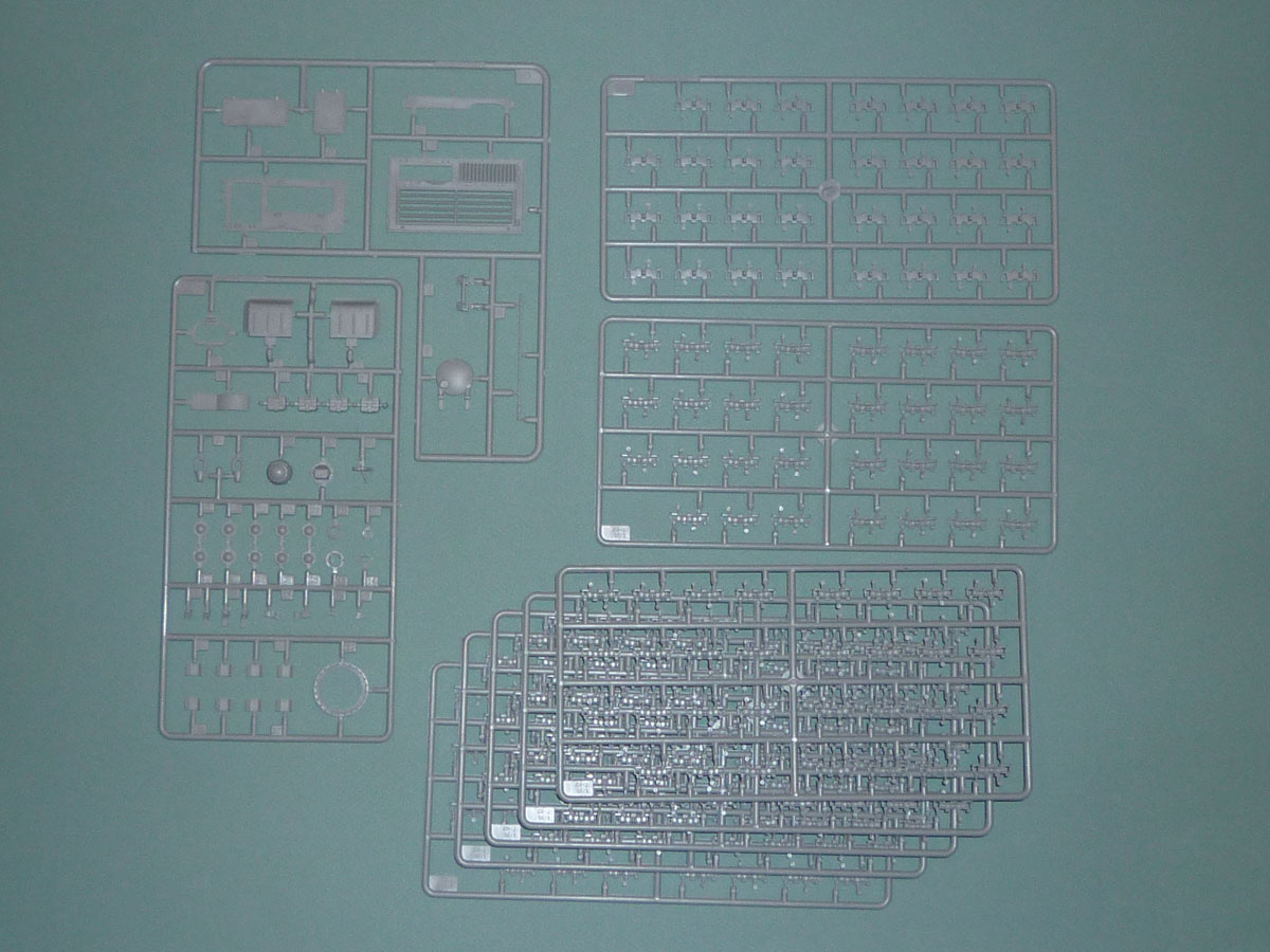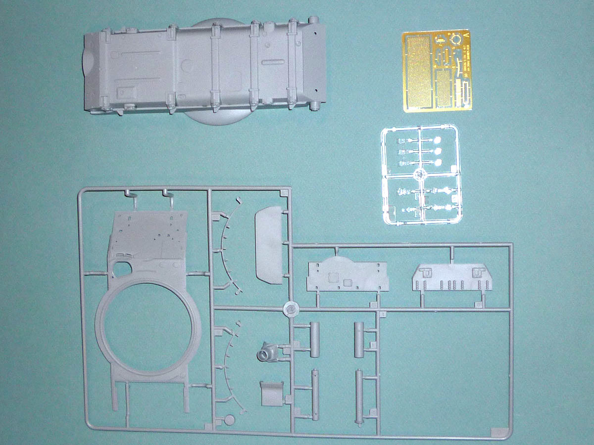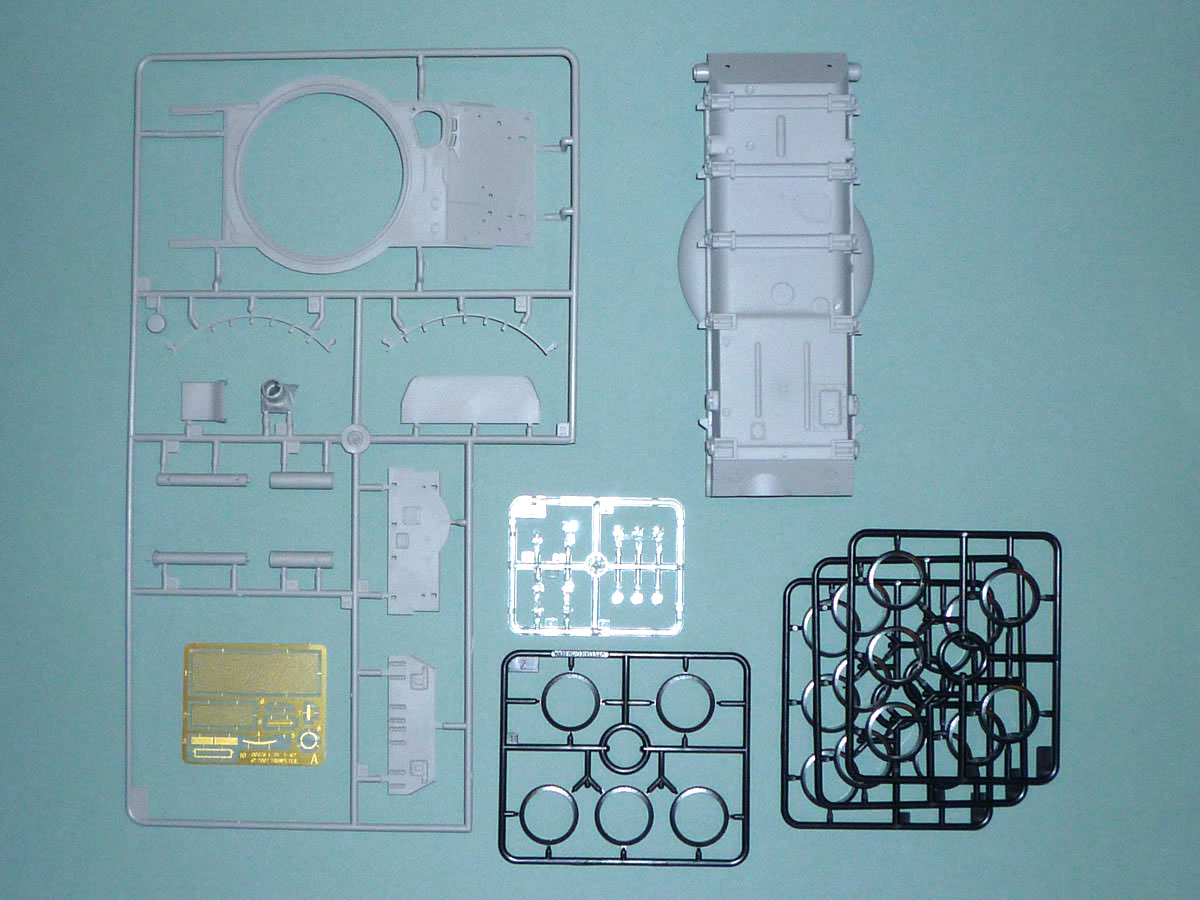 As one new to modeling AFVs, my first impression on receiving the sturdy 10”x16” corrugated cardboard box was one of “the Incredible Hulk.” Unlike the Aurora tanks of old where the big box contains a small model, this box needs to be as big as it is to hold the 11 bags holding 15 grey and four black plastic sprues of the road wheel tires. A separate compartment contains the lower hull, one clear sprue, and finally, like M. Creosote's “wafer-thin mint,” a small photoetched fret. A painting guide (spoiler alert: everything is forest green), a color flyer of upcoming kit attractionss, and the instruction booklet round out the collection.