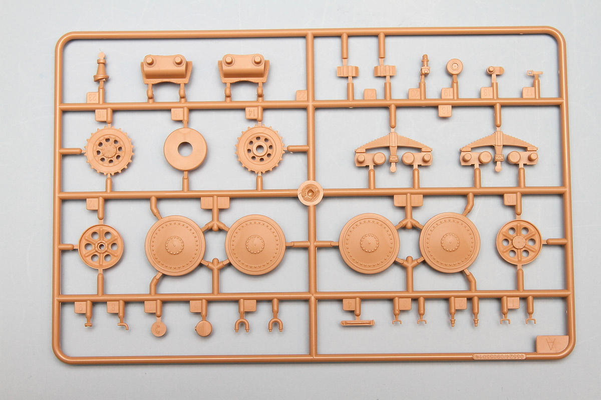 Construction starts with the hull and main running gear. The Hetzer chassis is a simple affair, with four wheels, a drive sprocket and an idler wheel on each side. Assembly looks pretty straightforward, with two bogies receiving two wheels each.