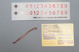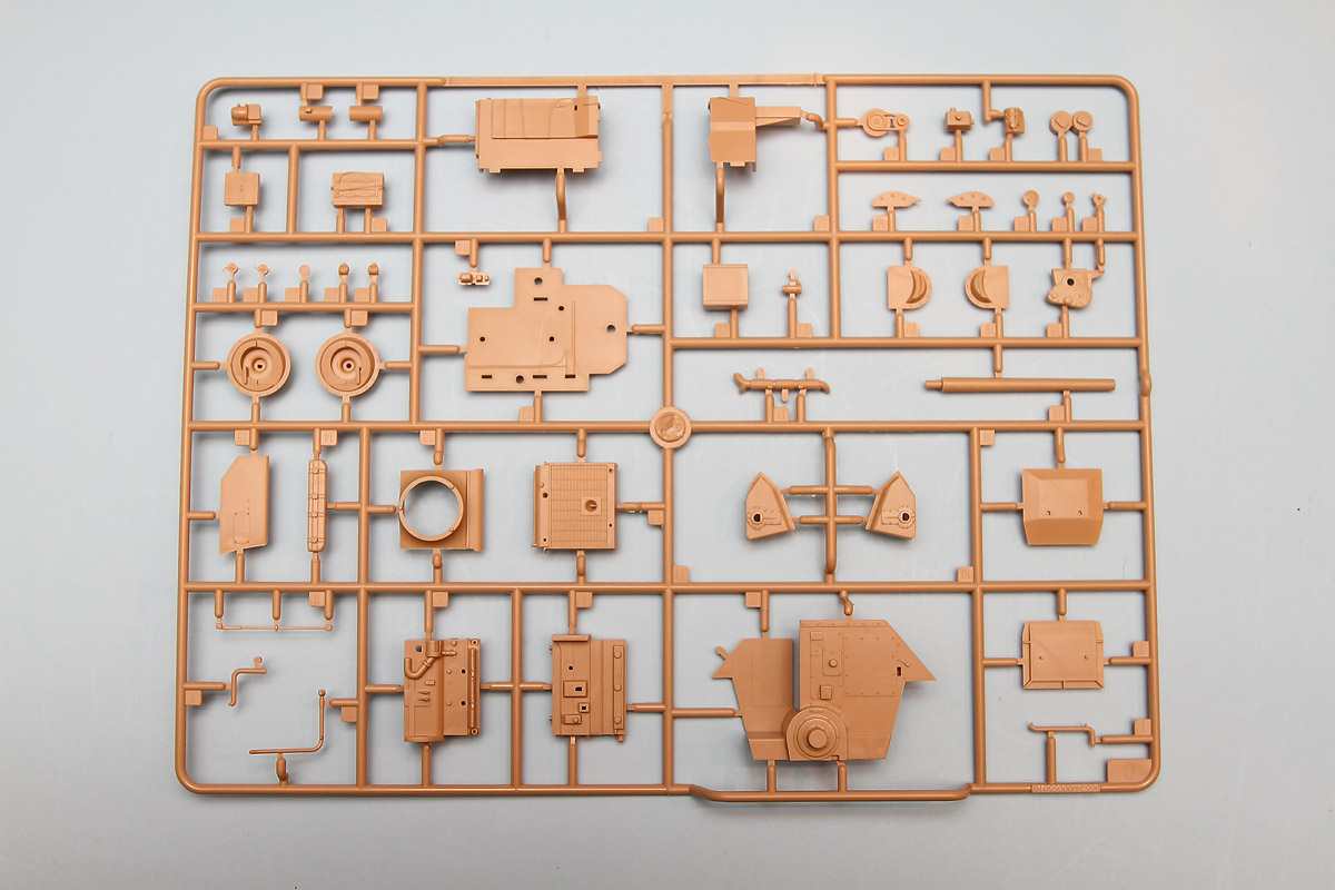 The Jagdpanzer Hetzer comes in one of Trumpeter's ubiquitous small sturdy boxes, containing four separately bagged sprues of yellow-tan plastic parts and a separate boxed-in section holding the main tank hull and chassis. In addition, there is a bag of individual track links on tiny sprues and six (additional) bags of 24 sprues each. These last sprues contain what look at first to be ammunition rounds, but, upon closer inspection, are actually very small pins molded onto posts. These pins are for the track. There is also a small fret of photo-etch as well as markings for one vehicle. A 12-page instruction booklet and a 5-view color sheet round out the contents of the box.