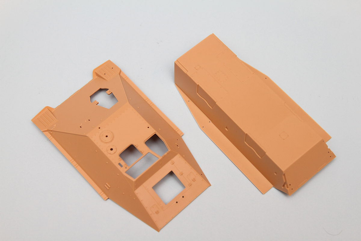 Construction ends with attaching the side schűrtzen and lowering the upper hull down onto the lower hull.