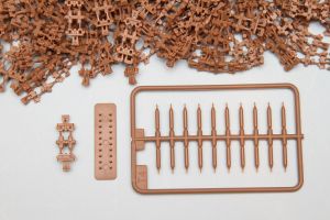 In step nine, the track is assembled and attached. Trumpeter chose to use ‘ModelKasten’ type of track. Instead of glue, the track is held together by tiny plastic pins, and, if all goes well, is articulated. The 680 parts consist of a bag of 200 individual links, s small, flat assembly jig, and 480 posts, each with the aforementioned tiny pin at one end.