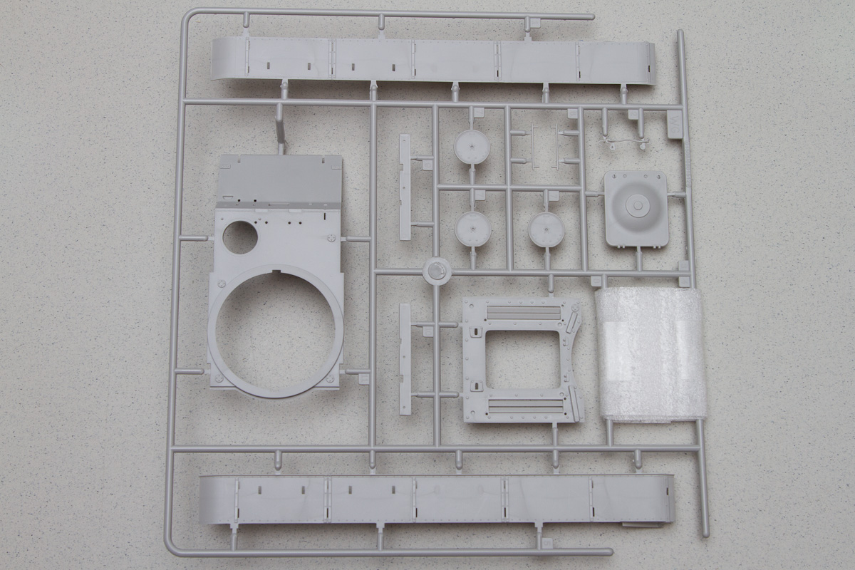 Construction continues along familiar lines. The prominent diesel drums are simple, four-piece affairs that do not have any PE included. The hand rails along the top rear hull are thin and delicate (they came wrapped with special foam packing). The main gun is provided in both aluminum and a single slide-molded plastic piece – nice! String is provided for tow cables but will probably look better if replaced with twisted wire.