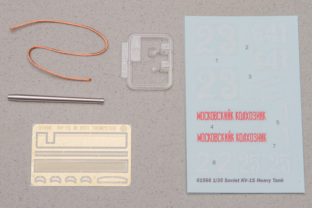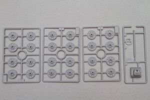 The KV-1S comes in one of Trumpeter's ubiquitous sturdy boxes, containing 11 separately bagged sprues of soft, light grey plastic parts and a separate boxed-in section holding the main tank lower hull and an additional 12 sprues sporting 16 individual track links each.