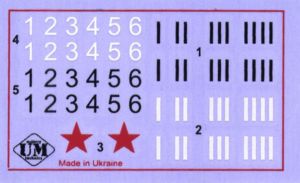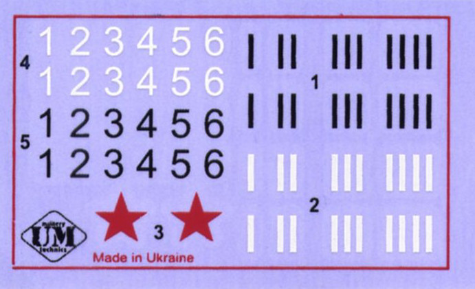The small decal sheet includes 2 red stars, 2 sets of short black and white lines and numbers. They are legible and well printed. The 2 black plastic parts are a pair of railroad tracks and they're the foundation for a cool display base. The instructions are legible, well printed and consist of 8 simple assembly steps. Color callouts are for Humbrol enamels. There's a black and white painting diagram in the instructions and a full color one on the box underside, which is a nice touch.![]()
