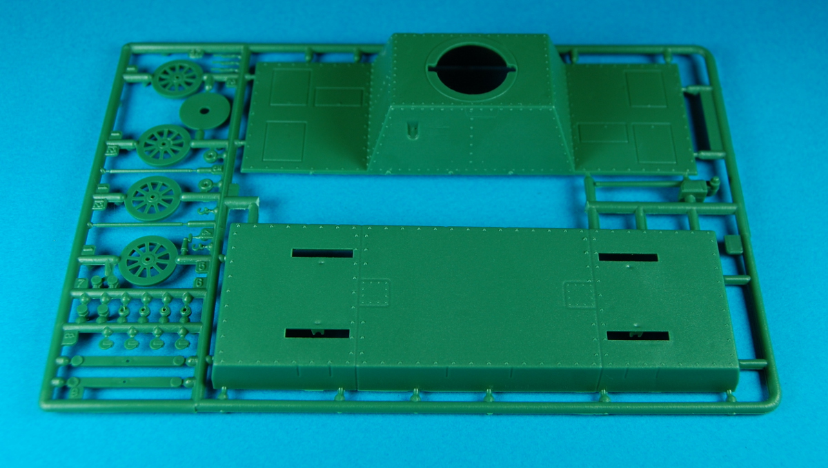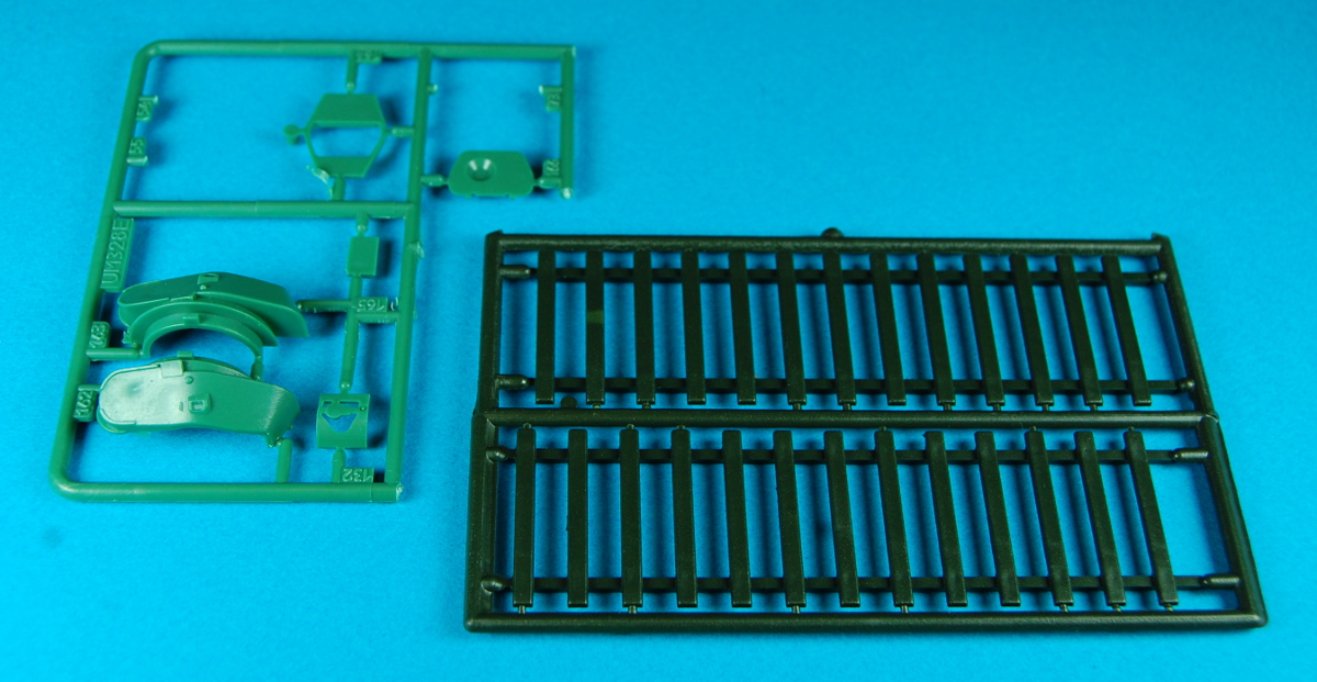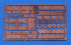The kit comes in a stout, end-opening cardboard box. It consists of 72 parts, 2 of which are black plastic, 36 green plastic on 2 sprues, and the rest are photo-etched and attached to a single fret. The plastic parts are well molded with minimal sink marks. The sprue attachment points are large and some are almost larger than the parts themselves, so use a razor saw to remove them from the sprues. The p/e parts are access hatches, doors, etc., and are well done.