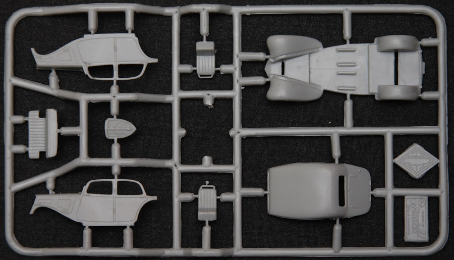 Construction is straightforward. The one-piece chassis includes the floor of the interior, with separate seats. On the underside, there are various brackets, axles, the exhaust pipe, and the characteristic curved bumpers. No engine is included, other than a molded-in relief on the underside of the chassis. The headlights and taillights are separate, which is a good thing as that allows you to model a larger variety of Traction Avants (the 1938 variant introduced a single taillight, while the twin taillights were re-introduced in the late 1940s/early 1950s).