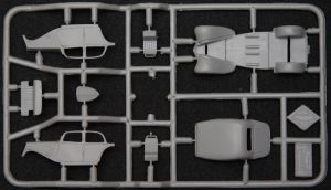 Moving on to the body, this is made up from four pieces: two sides and a top, and a separate front grill. The dashboard is separate, with the steering wheel fitting to that. There is no firewall provided, which means that looking through the rear window gives you a complete view straight up to the grill. It is highly recommended that a simple firewall be added from scrap plastic. Likewise, there are no pedals provided, and those too would be simple additions from scrap plastic (don't forget the clutch: it may have been front wheel drive, but it wasn't an automatic!).