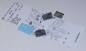 Each Jeep is a single piece of resin that will need to be carefully removed from its pour block. Once that's accomplished and the vehicle is cleaned up then you can attach the other items that come with the set. Brengun supplies a photoetch fret that contains a shovel, axe and steering wheel for the Jeeps (there are actually more parts on the fret, but the fret is labeled "1/144 Cars" so appears to be a set added to other model car sets).