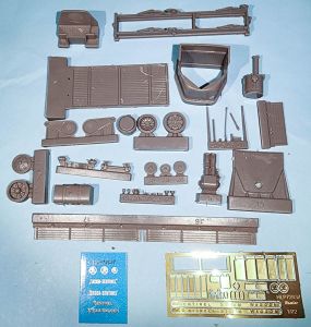 The Hauler 1/72 Skoda-Sentinel consists of 35 pieces of gray resin and a photoetch fret with 30 pieces. The molding is very nicely done and the detail is exceptional. The most difficult part of construction will be removing the parts from their pour blocks, especially the chassis. First, you'll want to clean the area "inside" the leaf springs since those areas should be "open", and then removing the one-piece chassis from its pour block will be time consuming. Having the right tools will help, and maybe this is where a jeweler's saw will come in handy. In any event, take your time and keep a close watch on where your blade cuts.
