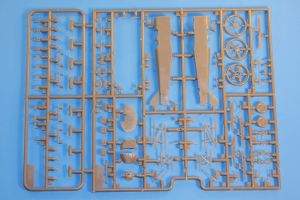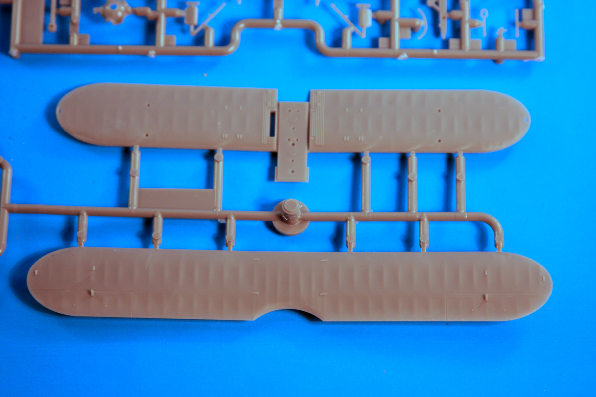 The 104 part kit is molded in brownish gray styrene with semi-matte finish and very fine molding gates. The one piece wings have the sharpest trailing edges that I’ve ever seen on an injection molded kit. Holding the wing up to the sun easily shows how thin that trailing edge is. I removed the fuselage halves and lower wing to test fit for this review. The tiny locating pins in the fuselage halves click together and shouldn’t need any filler. In fact, you can put the halves together, and shake it without the other half flying off! The pins and sockets are molded into the edges and there are no sink marks that I could find. The lower wing has an edge where the fuselage drops in, so the wing/fuselage joint will not require any filler.