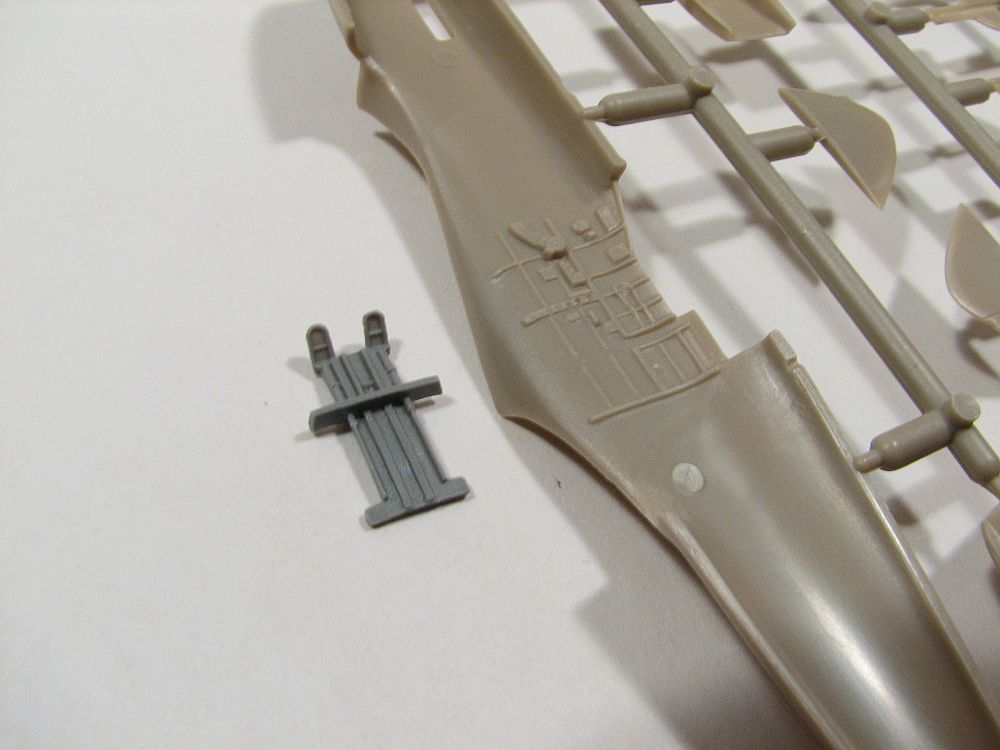 Construction starts with the cockpit, by assembling the control column and front bulkhead/instrument panel to the floor, followed by the seat to the seat back, the seat back to the reard bulkhead, and the seat supports to the bulkhead and seat. Out of the box the cockpit is extremely well done, and the only items missing are seat belts. Once the finished cockpit is glued into one fuselage half, then the halves can be joined together, and the rudder (once you're sure of which one you'll need) and gun sight can be added.