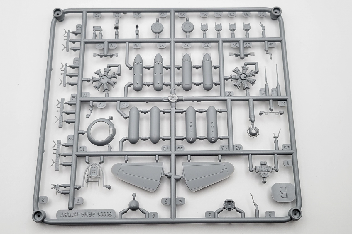 The engine is set up similar to other radial engines in Arma kits, with two individual cylinder banks, a two-piece connecting rod assembly, and a separate crankcase housing. This fits onto the one-piece cowl flap piece that goes on the front of the fuselage. Right behind this are the inserts for the two styles of exhausts, so you will want to pay attention to your references should you opt to build a scheme not from the kit. The cowl itself is built up from four side pieces and a single front ring.