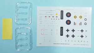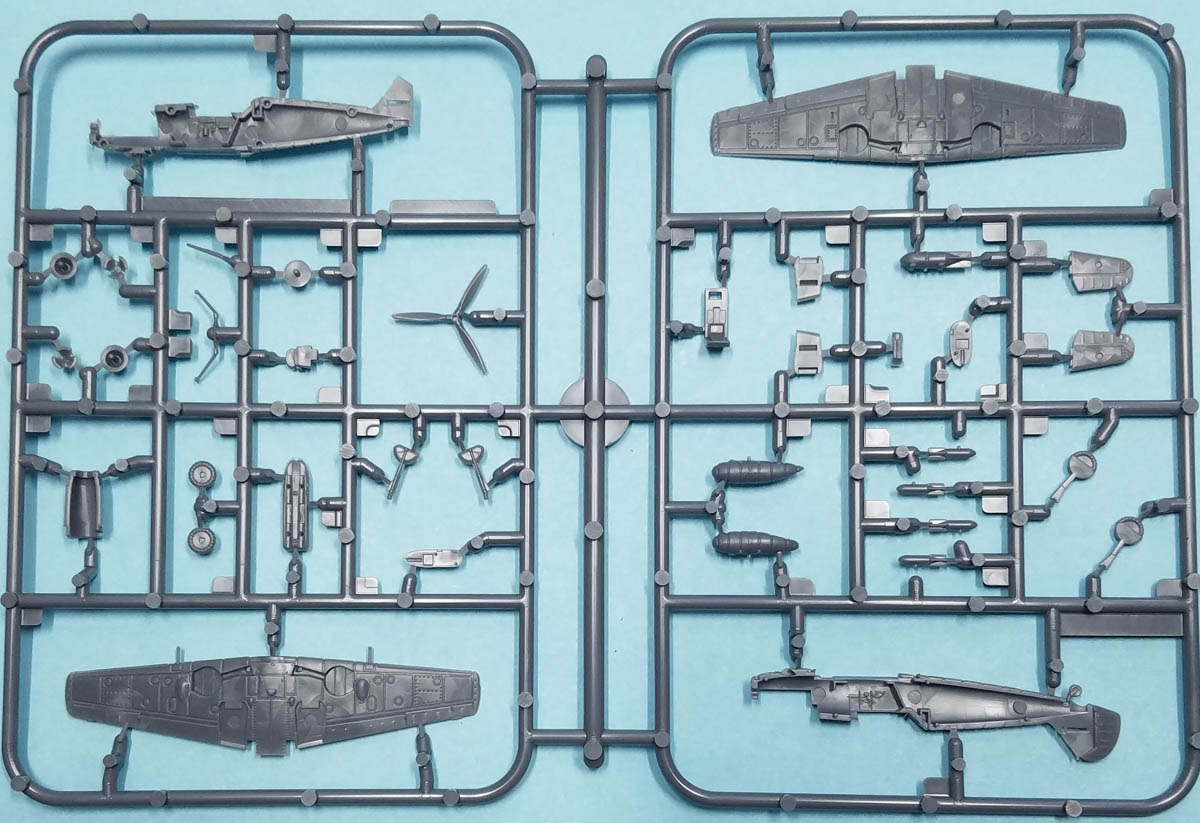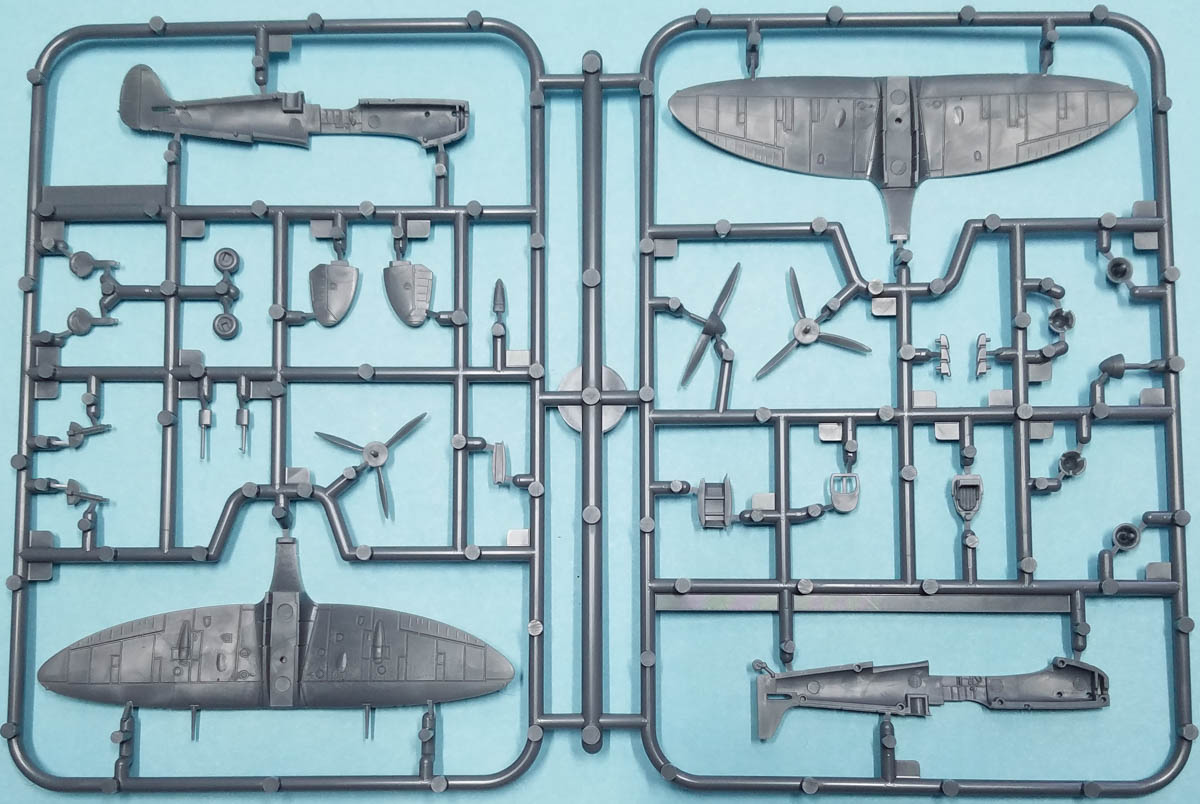 The Beacon Models 1/144 Spitfire Mk.Ia vs Bf109E-4 release consists of one Spitfire Mk.Ia (with 29 pieces of gray, injected plastic and three clear, injected canopies) and one Bf 109E-4 (with 37 pieces of gray, injected plastic and three clear, injected canopies). Note that both kits contain extra parts, so if you have the knowledge and decals, you can make different versions of each type. For example, the Spitfire has three different propellers, including a two-blade version so you can create the early form of the Spitfire Mk.I. Also included in the set are canopy masks for both models.