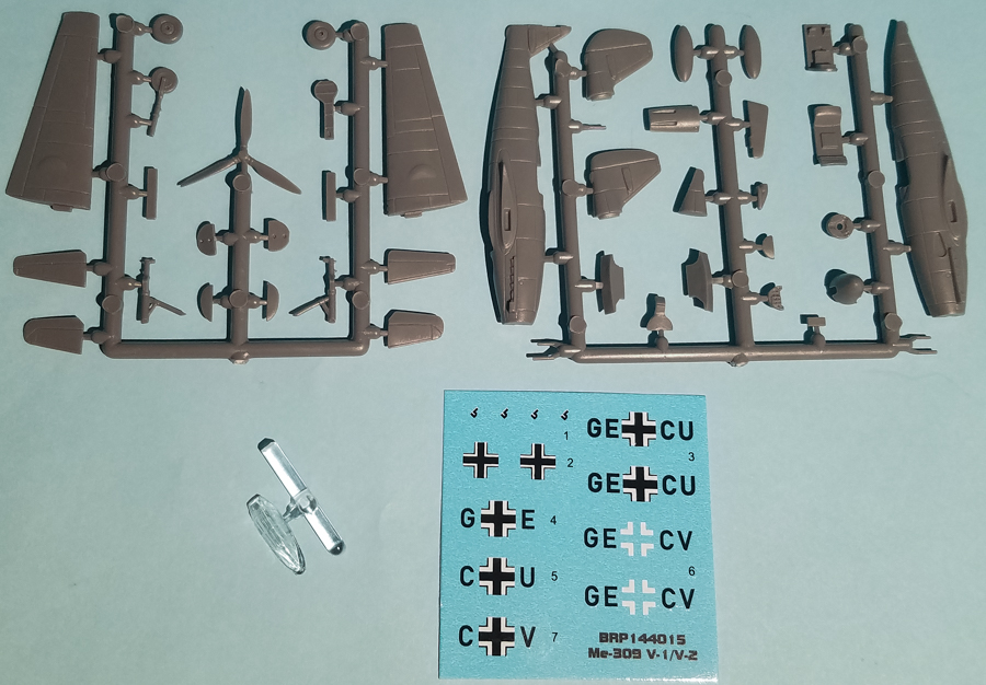 The Brengun 1/144 Messerschmitt Me 309 V1/V2 consists of 38 pieces of gray, injected plastic on two sprues (some parts not used with the V1/V2 versions) and one plastic, injected clear canopy. Decals are for two markings of the V1 and one for the V2: