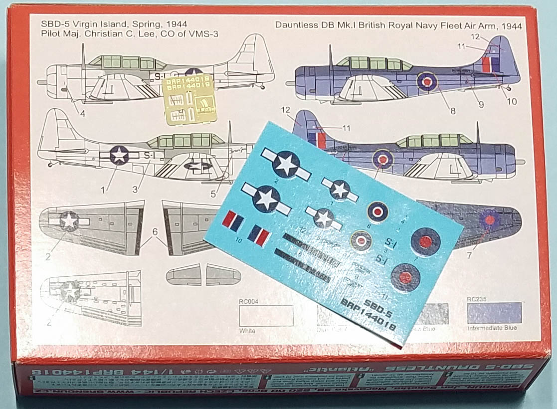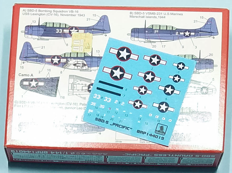 The plastic in these SBD-5 boxes is exactly the same as their SBD-3 releases, the only difference is the cowl you glue on the front. Brengun has released two different boxings, "Atlantic Theater" and "Pacific Theater" with different decals.