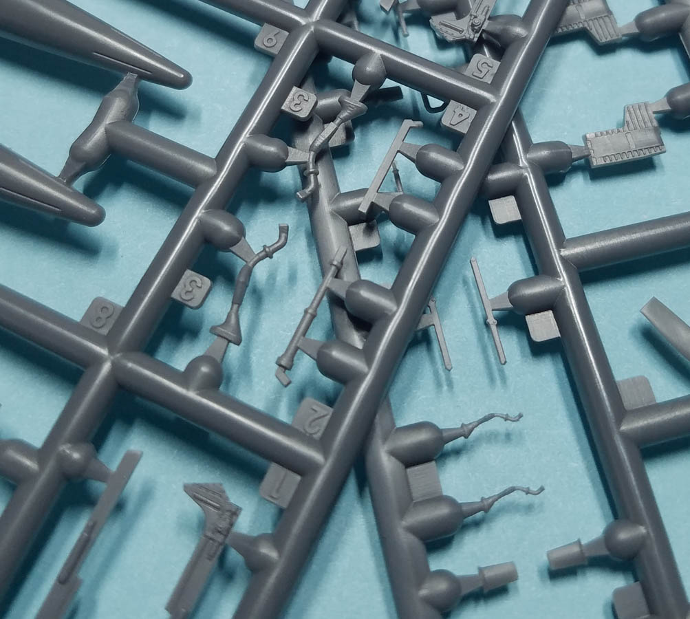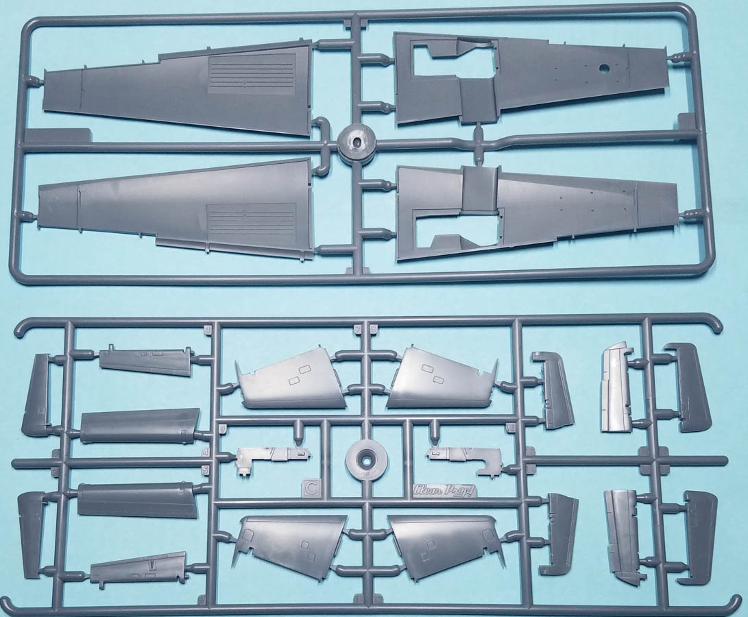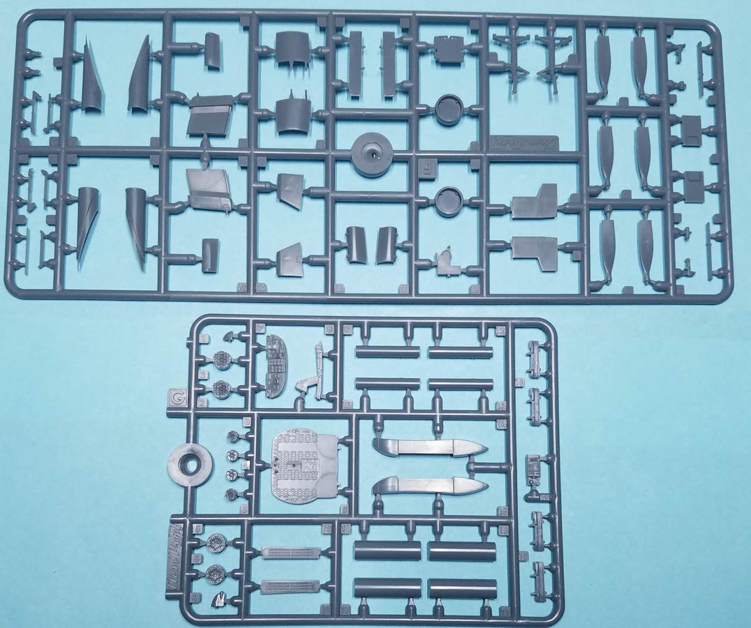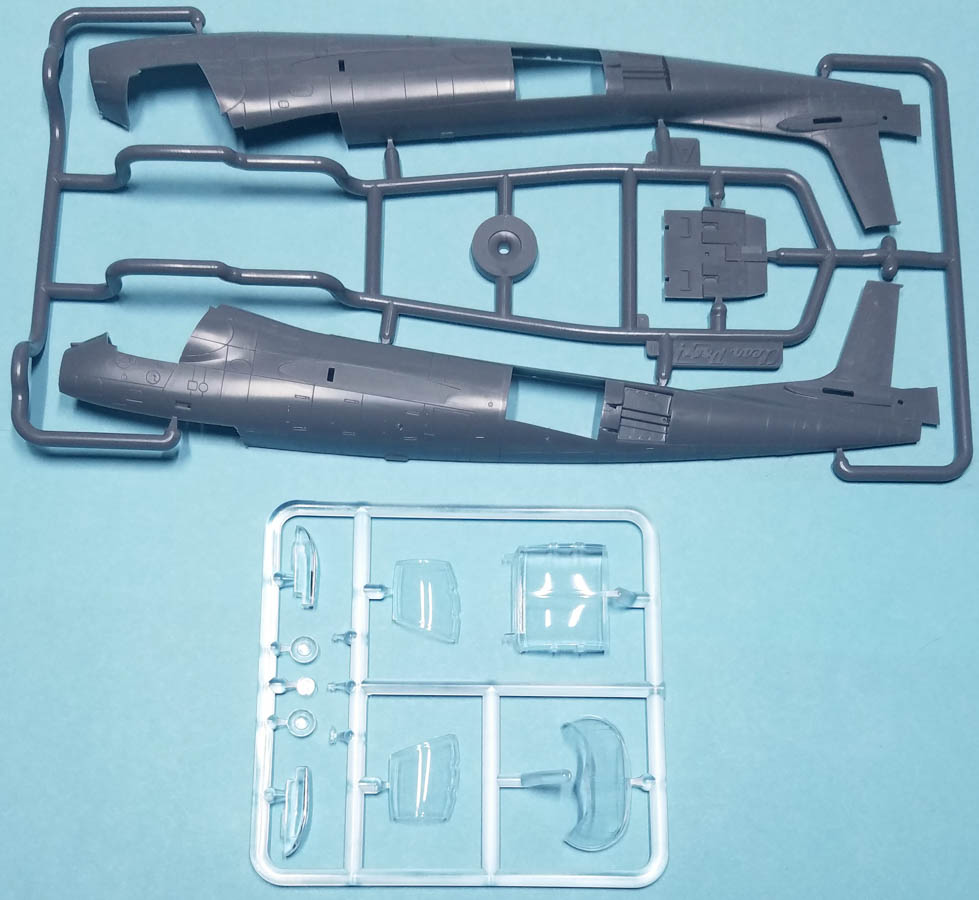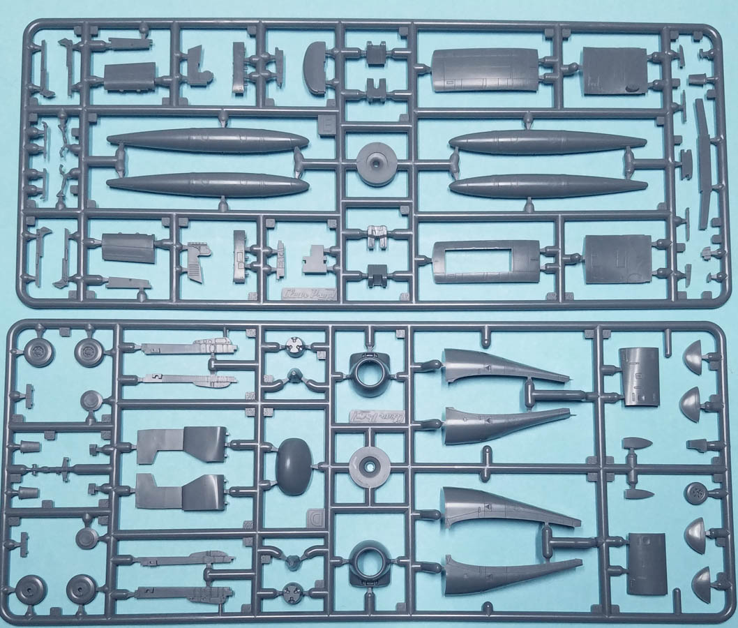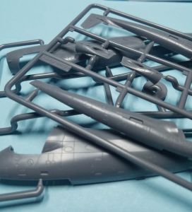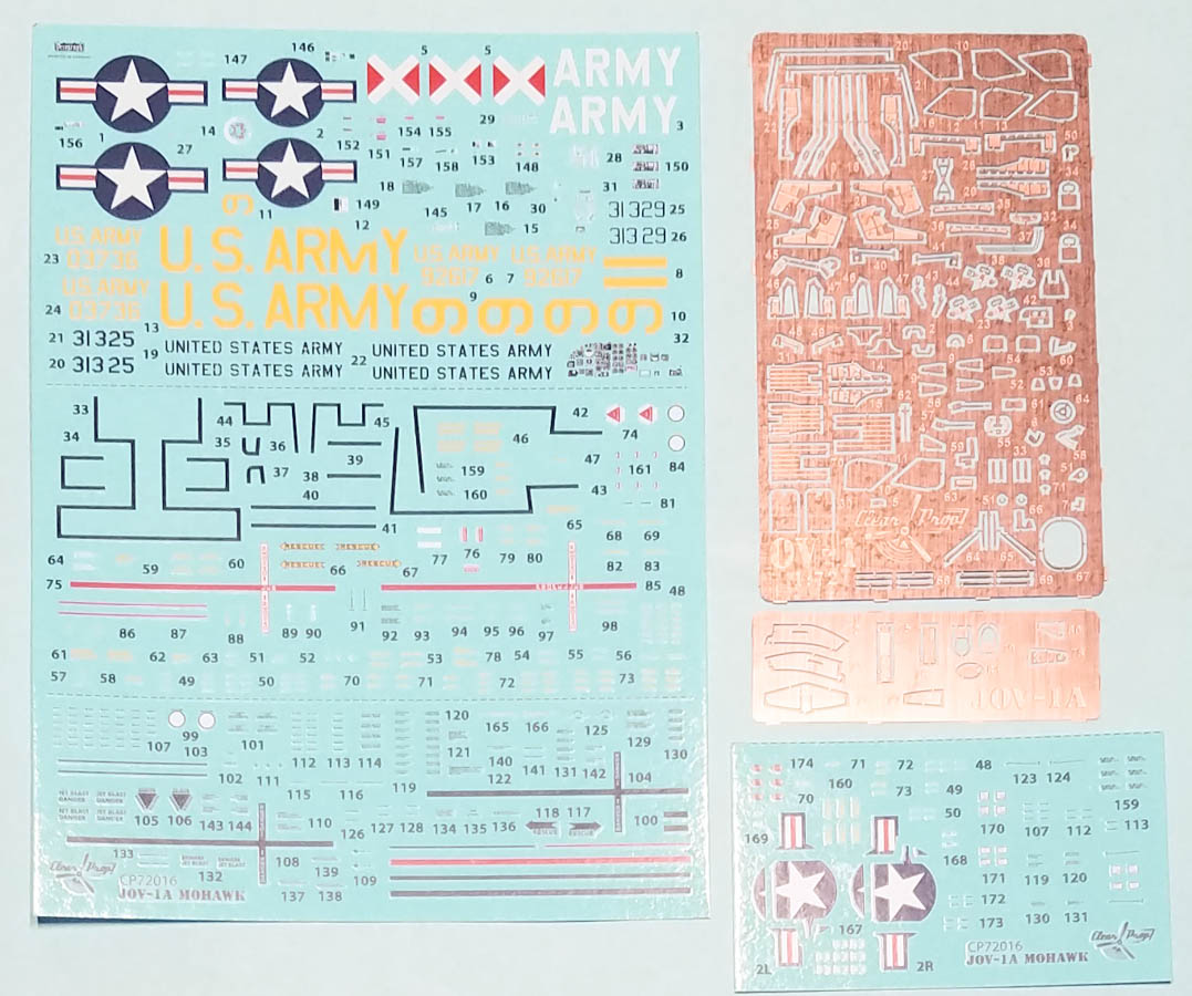 The 1/144 version of the Mohawk has 69 pieces of gray, injected plastic, and the parts count includes six pieces of clear sprue, two of which aren't used with this version. There is no photoetch fret included. There is no separate, uppper fuselage piece to differentiate between the JOV-1A and the OV-1A; you'll need to worry about that difference yourself (which mainly adds a protuberance near the cockpit, on the starboard side).