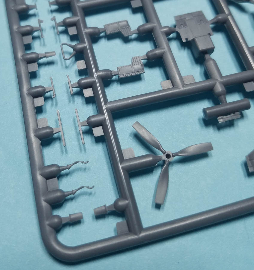 Since the Mohawk tended to have its props feathered while on the ground, the 1/72 kit allows you to do that, since the prop blades are separate from the spinner. Unfortunately in 1/144 the prop blades and spinner are all one-piece, meaning you'll need to cut the blades from the spinner if you want to display the blades feathered.