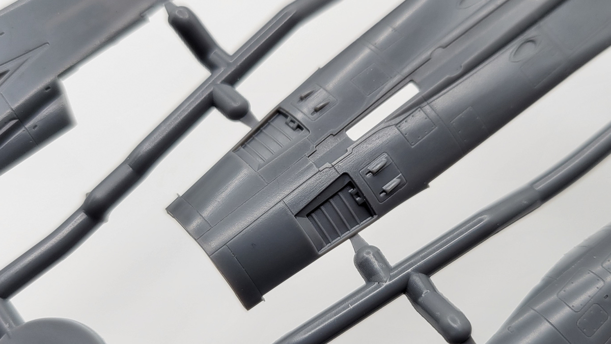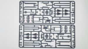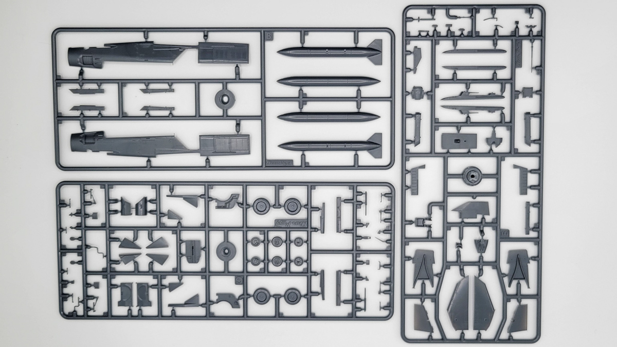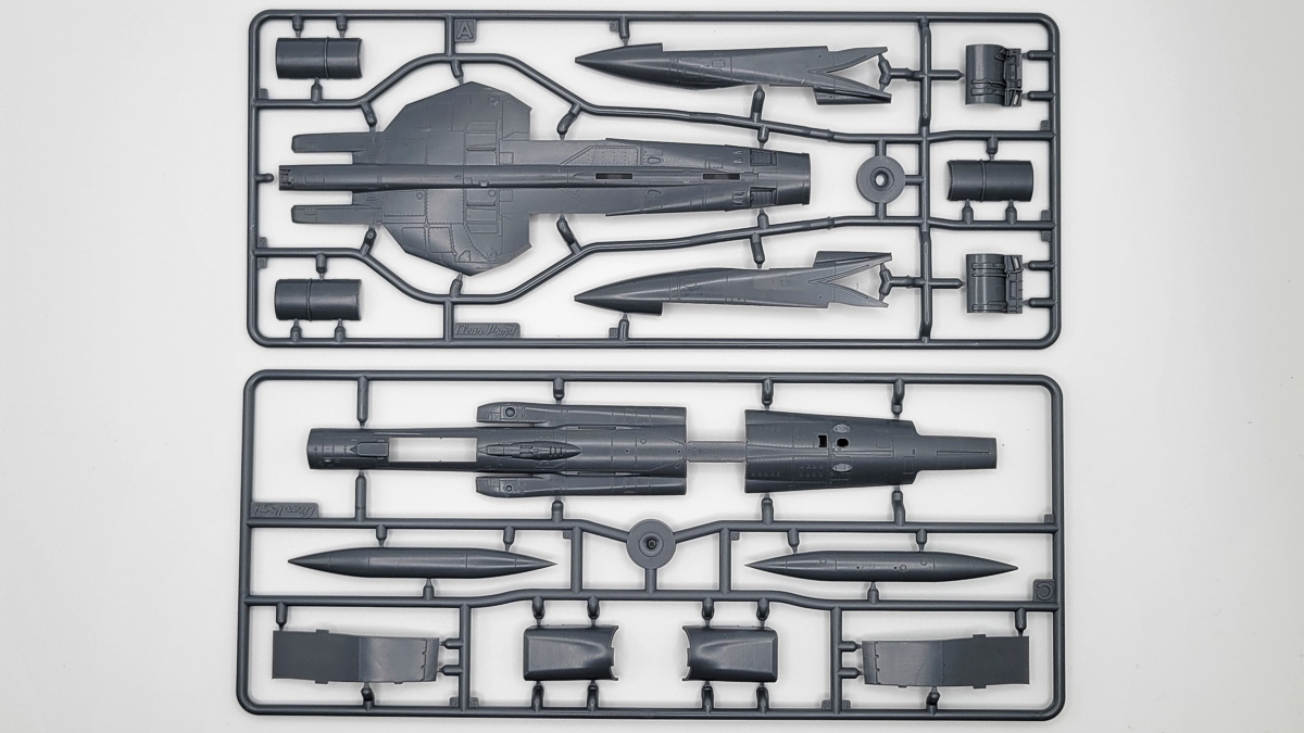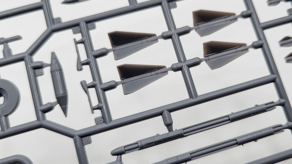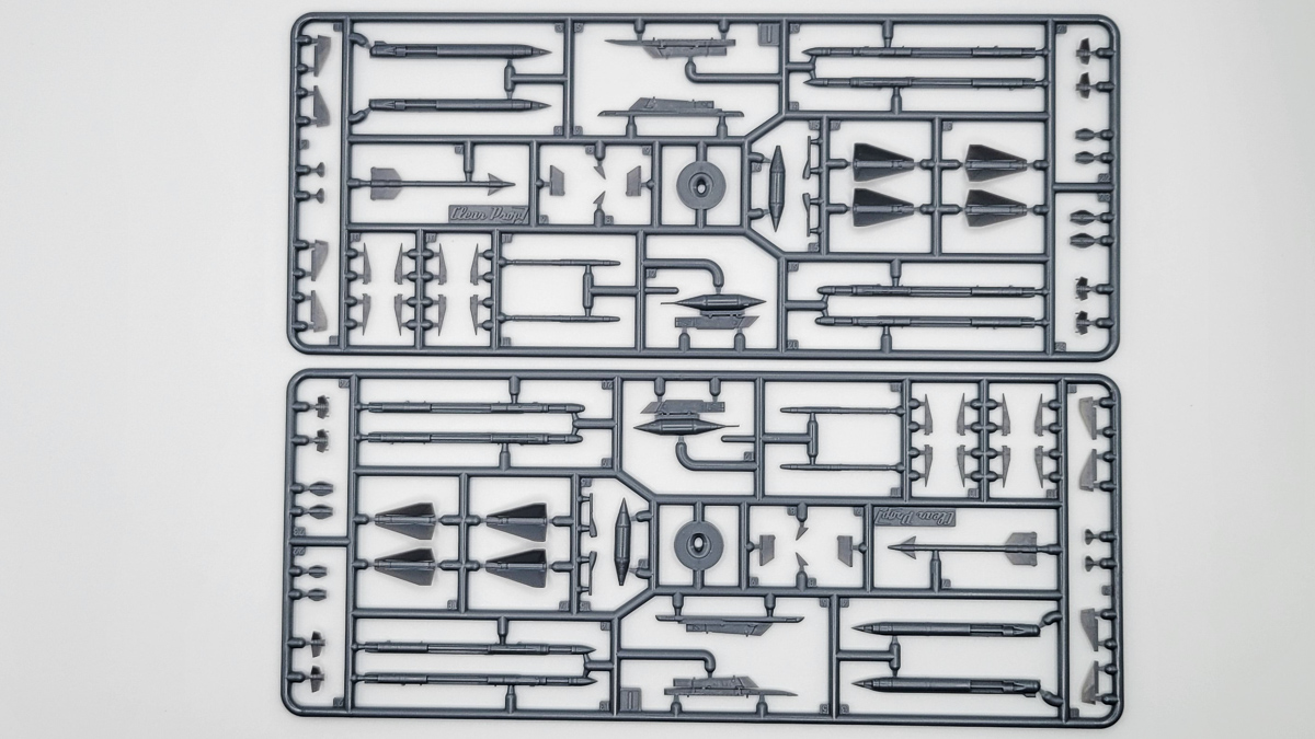 With the airframe together, the fun isn’t over, because this kit comes with just about everything that could be hung underneath the MiG-23. There’s a centerline tank and two wing tanks. For weapons, the kit comes with loads of missiles: two R-23R/Ts, two R-24R/Ts, two R-13Ms, four R-60s, and two Kh-23Ms. To go along with the Kh-23Ms, the kit also includes the Delta-NG pod. The missiles are nicely engineered with separate fins all around that will result in nice, thin fins and clean details on the missile body. A diagram shows all the possible combinations of these weapons so you can have an accurate yet unique loadout.