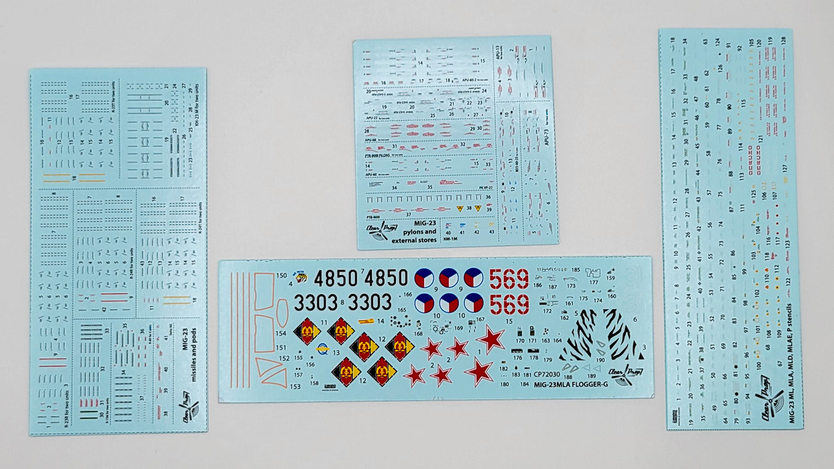 The Mikoyan Gurevich MiG-23 has been the subject of a fair number of model kits in 1/72 over the years, but given the type’s large production run, we haven’t had a really good kit. Clear Prop has filled that gap for us with what is hands down the best 1/72 MiG-23 kit out there. This expert edition plays up to that name as well, with the cockpit alone having more parts than most of the other MiG-23 kits out there have in their entirety. The kit comes with ten sprues of gray plastic, one of clear, two photoetch frets, and four decal sheets that cover the two Czech, one Soviet, and one East German options included.
