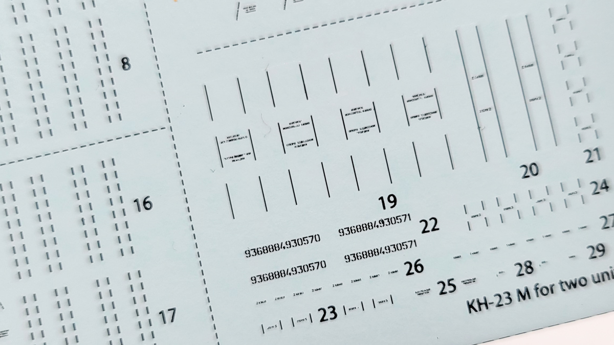 The decal options in this kit cover two Czech, one Soviet, and one East German option. All four options have similar camouflage colors consisting of an underside of blue-gray and an upper surface camouflage of two shades of brown and two shades of green. One of the Czech options is from 1983, with 4850 on the intake, while the second is from 1990 and features a tiger-striped rudder and 3303 on the intake. The Soviet option is a simpler finish, with just an outlined 31 on the nose, while the East German one has red 569 on the nose. The decals include a full set of aircraft stenciling as well, along with a full set of stenciling for the missiles.